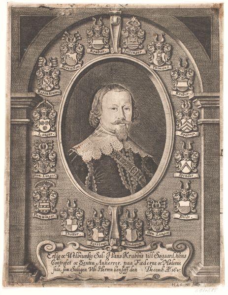 Curator: Looking at this print, “Christen Skeel. Mindeblad,” created between 1666 and 1669, what strikes you first? It's by Albert Haelwegh. Editor: Well, the somber intensity for sure. All that careful detail… the face so serious, the heavy shadows, even the way the frame presses in, it all feels designed to make you ponder life’s heavier questions. Curator: The details in these baroque prints are rather striking. There are, of course, heavy symbolic layers at play here. You have the figure in the center, surrounded by a carefully constructed frame supported by allegorical figures and ornate details. What readings do these extra characters offer you? Editor: Those figures bookending him! It’s an explicit attempt to immortalize, to present Christen Skeel as this...idealized man, flanked by these...ideals. Notice the grotesque masks adorning their shields. Do these shields symbolize some internal or external battles? Is this supposed to ward off evil spirits or embody an inner torment? It’s intense. Curator: The frame, wreathed in laurel, typically speaks of victory, honor. The two helmeted figures each holding shields point to that heroic depiction. I find these memorial prints so interesting because, although intended for a specific person, the iconography touches universal themes about memory. Editor: The artist attempts to capture a life and legacy in symbolic form. It's powerful, really, how images can compress and carry all this cultural baggage across time. Curator: Do you think the portrait succeeds in that purpose of eternalizing the individual and his importance? Editor: Hmm... I think that's a bit beside the point, right? Because even if we no longer remember exactly who Christen Skeel was, the print still makes us ask important questions about the relationship between the past and the present. And I believe, fundamentally, that art has more of a job for the future. Curator: So true.