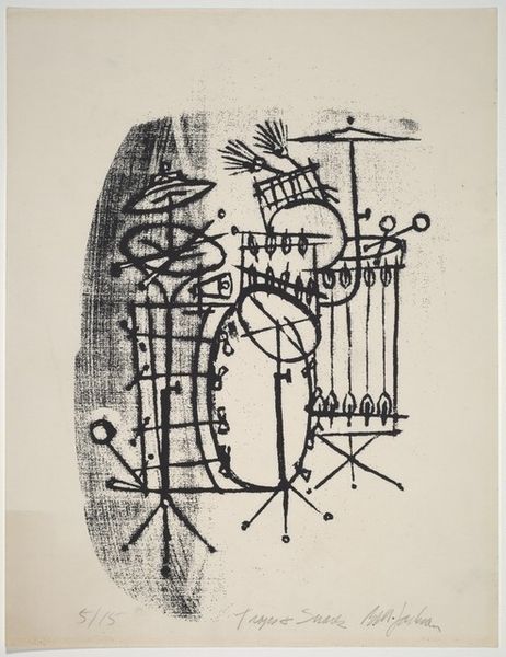 Billy Morrow Jackson made this print, Duet, using black ink on paper. It's hard to say when exactly, but he was active in the mid to late 20th century, so it’s from then. The lines are so immediate and raw; you can almost feel the artist sketching. It's not about perfection, more about capturing the energy of the moment. It reminds me of improvisational drawing, where you just let your hand go and see what happens. I love how the sparse ink creates the figures of musicians. They're not realistic, but they convey the feeling of jazz. Check out the saxophonist's head. Jackson renders it as a splatter of ink. It's as though he's trying to capture the sound of the music. It is a refreshing approach to form. This piece feels like a cousin to the work of Romare Bearden, who was also working with jazz themes. Both artists capture a certain energy. Ultimately, this print is an open-ended expression, leaving room for individual interpretation.