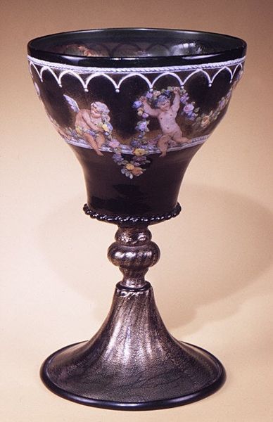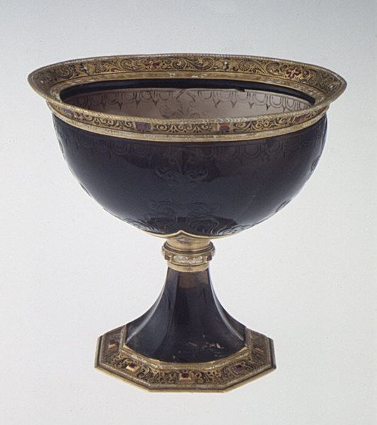 This cup was crafted by Reinhold Vasters, an artist active in the 19th century, and is currently held at the Metropolitan Museum of Art. The cup is a striking example of ornamental art. Notice the overall form: an undulating bowl resting on an ornate stem and base, it evokes a sense of classical elegance. The deep brown, almost marbled appearance of the stone provides a rich, earthy contrast to the intricate gold and enamel detailing that embellishes the rim and base. The cup blends natural forms with highly stylized ornamentation, typical of Renaissance revival styles. Look closer, and you'll observe how the curves of the bowl mimic natural shell forms, while the gold detailing adds a layer of artifice. The structure and detailing destabilize the boundary between nature and art. What meanings emerge when a functional object is elevated to a status symbol?