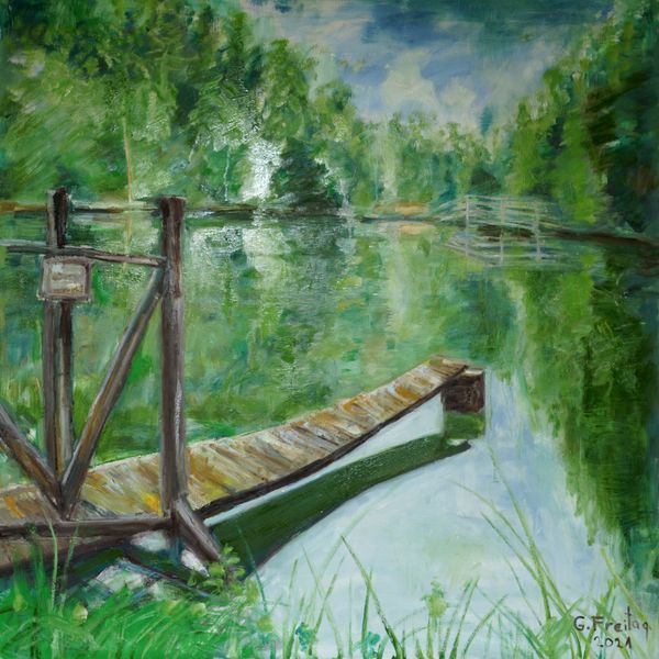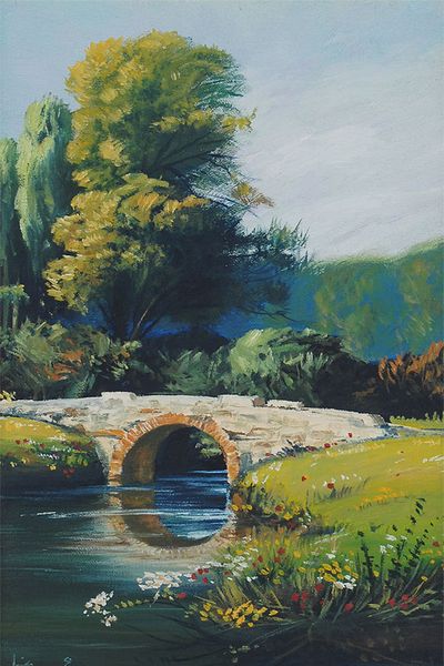 Curator: Gazmend Freitag's "Bridge on the Seugne," created in 2013, immediately brings a sense of calm. Editor: Yes, a really dreamy and idyllic image. It feels classically impressionistic in its depiction of light, and it has such a soft, almost blurred quality. I am intrigued to learn more. Curator: Freitag, known for his plein-air landscapes, captured this scene using acrylic paint and impasto techniques, resulting in a textured surface that amplifies the natural elements. Think about the labor of painting outdoors, battling elements and light. It highlights the artistic process so integral to the work itself. Editor: Right, but there is a constructed reality that we cannot forget. Bridges, symbolically and practically, connect spaces. Who built this bridge? Who is able to use the bridge, and whose access is restricted? This painting offers us an image of placid nature, while also holding complicated implications for social connection and division. Curator: I appreciate your focus on those critical questions! The visible brushstrokes, the very materiality of the paint, contribute to the sense of movement within the scene. Freitag is inviting us to experience the fleeting qualities of light and atmosphere in his depiction. He’s engaging with a lineage of painting in terms of process and studio practices. Editor: And historically, artists like Monet painted water lilies and garden scenes to reflect on social isolation or to contemplate nature as a respite from political strife. So while it is fair to appreciate this painting for its skillful brushwork and material quality, we can ask what political anxieties might have shaped the work. The Seugne River exists in a place. What local tensions are smoothed over by this soothing pastoral painting? Curator: Absolutely. Examining the historical context is crucial for fully understanding the art. Seeing it as simply "beautiful" is an incomplete view. Editor: Exactly. It’s an invitation to reflect on both the pleasure of artistic creation and also to think about our social structures critically. Curator: Well, thank you, as always, for shedding that light! I leave today with a heightened appreciation for how materiality and landscape, while beautiful, should be taken into account, given larger social and historical landscapes. Editor: And I appreciate thinking more carefully about materiality, as well as labor. Thanks for widening my perspective on both visual pleasure and political realities.