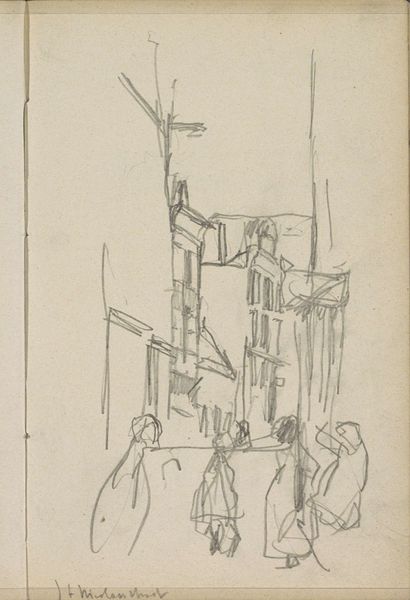 Editor: This is "Oudezijds Kolk met de brug in de Zeedijk" by Cornelis Vreedenburgh. It’s hard to pin down a specific date, but the Rijksmuseum lists it as between 1890 and 1946. It's a pencil and ink drawing of a cityscape in Amsterdam, very sketch-like. I find it very… immediate, like a snapshot of a moment. What do you see in it? Curator: I see the democratizing effect of Impressionism on subject matter. Here's a scene of everyday urban life elevated through artistic attention. Look at how Vreedenburgh uses quick strokes – less about meticulous detail, and more about capturing a feeling, an atmosphere. Why do you think such scenes became popular subjects for artists at this time? Editor: Well, perhaps as cities grew, so did people’s interest in depicting their surroundings? A sense of civic pride, maybe? Curator: Precisely! The rise of urban centers, alongside a growing middle class with leisure time and disposable income, fueled a market for images of the city. Art became more accessible, depicting the world of the average citizen rather than solely focusing on historical or mythological narratives. This piece really highlights that shift in the public role of art. Editor: That makes so much sense! I hadn’t considered the impact of a growing middle class on the subject matter itself. Curator: It shifts the patronage and the narratives the art reflects. Vreedenburgh presents a specific Amsterdam – can you tell, judging by this work alone, if it is meant to promote or critique the site it represents? Editor: Hmm, it's not particularly critical, I don’t think. It feels rather neutral. More documentary, perhaps? Curator: I agree. A quiet, observational approach. The drawing provides valuable insight into the visual fabric of Amsterdam at the turn of the century. An objective record like this helps inform urban studies in really significant ways, allowing us to imagine what life in this city would be like. Editor: It's incredible how much history can be contained in a simple sketch! I'll definitely think about the socio-political forces next time I'm viewing art.
