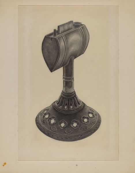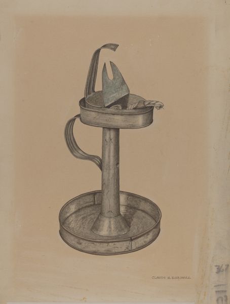 Editor: This is William Frank's "Colonial Lamp," created in 1938 using watercolor and drawing techniques. It depicts an old lamp, seemingly made of tarnished metal. There's a kind of quiet dignity in it, but also maybe a touch of melancholy. What historical narratives do you see reflected in this unassuming image? Curator: That "quiet dignity" is interesting, isn’t it? In 1938, a work like this would participate in a very specific kind of cultural work. Consider the date. The Colonial Revival was going strong. It idealized a simplified past, often downplaying the complex realities of colonial life, including its social inequalities and impact on indigenous populations. So, the question becomes: what exactly is this lamp *illuminating*, figuratively? Is it just a piece of history, or a symbol employed in a broader cultural narrative? Editor: So, the seemingly neutral act of painting this lamp is actually participating in a selective view of history? Curator: Precisely. Notice how it's presented: isolated, devoid of context, yet carefully rendered. This emphasis on craft and simple utility served to legitimize particular values associated with the Colonial era - self-reliance, industry - all carefully curated for a 20th-century audience during a time of great economic and social change. It suggests a usable past, readily available for a nation grappling with its identity. Editor: That’s a perspective I hadn't considered. It's not just about the object itself, but what that object *represents* at that particular moment in time. Curator: Exactly. And it encourages us to question why certain representations of history gain prominence while others remain hidden or forgotten. Think about what wasn't included in this seemingly straightforward image of a lamp and the political weight of those absences. Editor: That’s given me a lot to think about regarding the way museums curate and present these artworks. It highlights how selection and framing can construct a very specific historical narrative. Curator: Indeed. We can't divorce an artwork from the socio-political environment that both produced and received it. I learned a lot from thinking through your impression of the lamp and the cultural role this drawing could play in shaping viewers' perception of history.