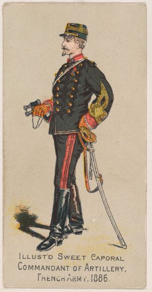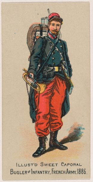 Editor: Here we have a print from 1888, produced by the Kinney Brothers Tobacco Company, entitled "Vice-Brigadier, Foot Carbineers, Italy, 1886." It was created as part of their Military Series to promote Sweet Caporal Cigarettes. It has an oddly formal feel. What do you make of it? Curator: It's fascinating to see military imagery being deployed for commercial purposes. Cigarette cards like this offer a window into how national identity and military prowess were marketed to the public. Consider how the image normalizes and even glorifies military service to promote a consumer product. Editor: So, it's more than just a picture of a soldier; it’s about the role of the military within society at the time? Curator: Precisely. These images were circulated widely and became embedded in everyday life. What effect do you think it had to circulate idealized and even unrealistic figures? Who benefits from that, and whose concerns and points of view are excluded? Editor: It's unsettling to think about how these cards, seemingly innocuous, shaped perceptions of military service. There is also a very Italian flavor. The hat, the jacket… Curator: Absolutely. The image aims to project Italian national pride. How do you think this image would have been received by the public? What aspects of Italian culture are amplified here? What elements of power and visual language do you see here? Editor: I hadn’t really thought of the public reception! That’s really made me think more deeply about the intended effect. Curator: Considering how art shapes public perception really broadens our understanding beyond just aesthetics. Editor: I’ll definitely look at things differently from now on, paying much more attention to who put it out into the world, and why.