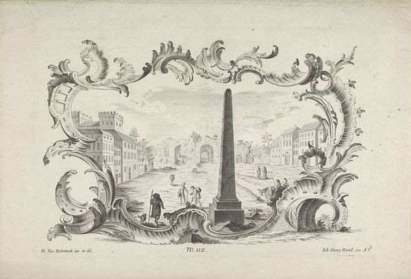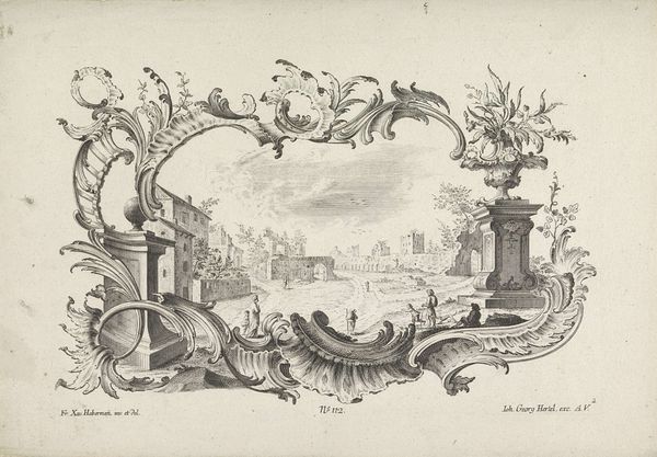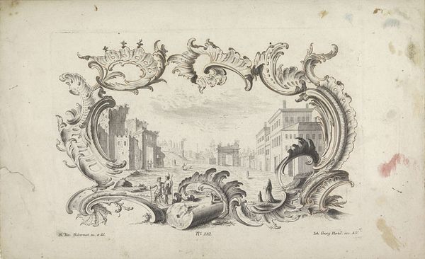 Editor: This intriguing piece, "Ruïnes in rocaille cartouche," dates back to between 1731 and 1775, and is attributed to Emanuel Eichel. It's currently held in the Rijksmuseum collection, and appears to be a pen and ink sketch on toned paper. What strikes me most is the juxtaposition of the decaying architecture framed by that elaborate, almost playful, rocaille border. What do you see in this piece? Curator: That's a wonderful observation. For me, the cartouche, as you noted, acts like a proscenium arch, framing a scene heavy with cultural memory. It evokes a feeling, doesn’t it? This piece invites us to contemplate the transient nature of glory and empire. Rocaille, with its associations of the aristocratic frivolity of the Rococo, frames images of Roman ruins – once symbols of strength and now echoes of vanished power. What message might Emanuel Eichel be trying to communicate? Editor: It feels almost like a commentary on the fleeting nature of power and beauty. The lively cartouche seems to mock the ruins it frames, highlighting their fall from grandeur. Curator: Precisely! Look closely, what do those ruins remind you of, emotionally? Do they stir up certain feelings or memories, even subconsciously? Artists like Eichel weren't simply sketching pretty scenes, they were using familiar symbols to communicate deeper truths about the human condition. The ruins aren't just architectural remnants, they're symbolic fragments of a shared cultural past. Editor: So, Eichel is using recognizable symbols, the ruins and rocaille, to create a conversation about history and memory? Curator: Exactly. The image suggests that what was once considered stable and beautiful eventually succumbs to time. Editor: I hadn't thought about the ruins as a symbol so explicitly before. It’s made me see how loaded these historical references can be. Curator: And that cartouche? Not so frivolous anymore.