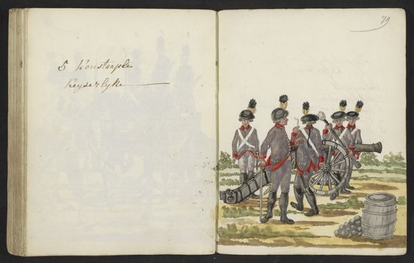 Curator: Carel Christiaan Antony Last, working in 1850, created this watercolor drawing titled "Maskerade van de Leidse studenten, 1850 (plaat 10)," which translates to "Masquerade of the Leiden Students." Editor: Right away, I’m struck by how festive yet somewhat somber the scene is. It's like a meticulously staged play—everyone's in costume, but there's an air of solemnity too, a slight remove. It's muted, pale colors almost give it the sense of an antique photo. Curator: The painting depicts a historical masquerade, likely referencing a specific event or era tied to Leiden University and perhaps broader Dutch history. We might think about how masquerades were a common way for privileged groups to engage in historical narratives, often reinforcing their social position and ideas about the past. How does the student element interact with 1850's historicism, a period in which thinking of "history" becomes newly powerful? Editor: I pick up on the idea of role-playing you mentioned, only, for me it is as if everyone is acutely aware they're in a costume—like, “Look at me pretending to be…!” Almost as if poking fun. Even in how stiff they're standing, but still enjoying the moment to peacock, parade even, especially with the horses and fancy weaponry, whatever is happening. Curator: That slightly unsettling effect is achieved in part by Last's commitment to precision and detail in depicting dress and facial expressions, drawing us into this almost self-conscious performance of history, and this tension plays into 19th century romanticism, emphasizing emotion while framing subjects with detailed backgrounds or environments. There are interesting tensions between that which is spontaneous, in contrast to that which is arranged or depicted "authentically". What is evoked? What is hidden? Editor: It’s intriguing to ponder that unease that emanates from this—it could very well be Last being hyper-aware and even making fun of that stiffness you're mentioning, almost like a quiet protest note on history. Thank you, I had so much fun looking through this lens at this. Curator: And, for me, seeing how a historical reenactment reveals how anxieties about social identity play out through time—in Last's present, but certainly still with us.