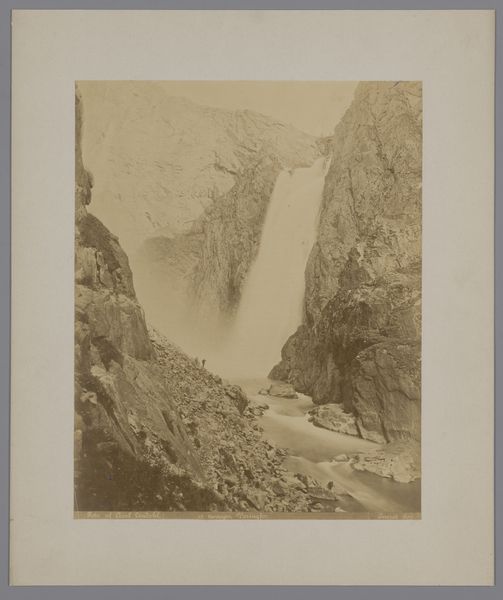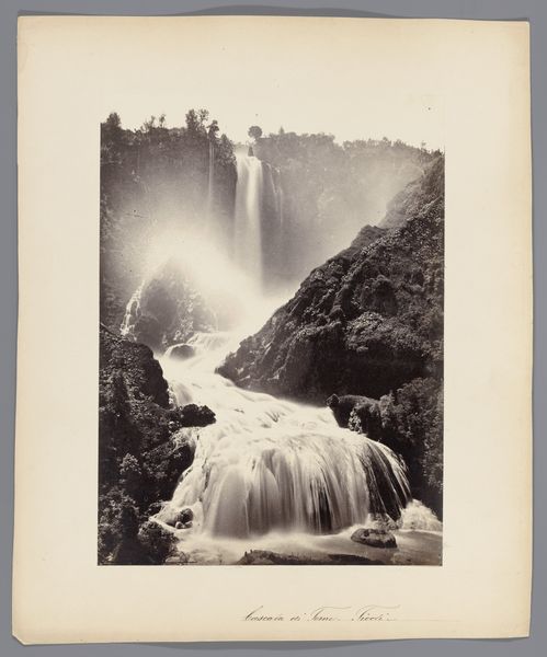 Editor: Here we have Nicolas Chapuy's "Waterfalls of Tivoli," a print combining lithography and etching on paper, created around 1848. It’s quite striking – the contrast between the dark, jagged rocks and the smooth, flowing water immediately grabs your attention. What elements stand out to you in this composition? Curator: Immediately, the careful balance achieved through contrasting textures arrests the eye. Note the deliberate arrangement: the cascading waterfalls offset by the solidity of the rocky foreground and the distant architecture. This interplay generates a certain tension and visual interest. Further, consider how light and shadow work together to emphasize the different spatial planes. What strikes you about how depth is created in this work? Editor: I think the layers – the foreground rocks, the waterfalls, then the mountains receding into the background – give a good sense of distance. It feels vast. The etching helps with that detail. Are there particular compositional techniques at play here? Curator: Indeed. The artist employs strategic blurring of forms in the background and varies the degree of contrast, manipulating light to guide the viewer's eye. This visual recession is further augmented by a subtle aerial perspective. Notice also the linear structure reinforced by the verticality of the falls and rock forms. Editor: That makes sense. I see now how the vertical lines guide your eye upward, drawing you into the distance. It's almost like a stage, meticulously constructed. Do you see this staged structure enhancing the viewing experience? Curator: Yes, that architectural quality creates an artificial yet engaging scenic vista. This artistic approach showcases the possibilities of pictorial structure, creating aesthetic value. The very nature of the composition underscores the careful formal planning inherent in the image. Editor: That's fascinating! It's less about a realistic depiction and more about the arrangement of forms. I initially focused on the landscape but now see that the artwork is meticulously constructed and has different structural depths, light quality and a carefully selected technique that create space, draw our eye, and make it all feel both natural and contrived. Curator: Precisely. Shifting perspective allows for an entirely novel appreciation of representational form.