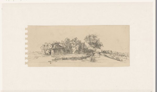 Editor: This is "Landscape with Brook and House," a pencil drawing by Barend Cornelis Koekkoek, made sometime between 1829 and 1844. It's currently held at the Rijksmuseum. The sketch has an enchanting, almost fairy-tale quality despite the humble materials. What captures your eye most in this landscape? Curator: The quiet intimacy of the scene speaks to me. I can almost hear the brook trickling, imagine the cool dampness of the earth. Notice how Koekkoek, though working only in pencil, manages to create such depth. It feels less like a precise record and more like a memory of a place. Editor: A memory… that’s a great way to describe it! The blurred edges do give it that feeling. What does the house signify to you? Curator: For me, the house anchors the romanticism of the scene, brings it down to earth with the promise of the everyday, of lives being lived within its walls. It’s not a grand castle, but a simple, solid dwelling, merging with the nature surrounding it. What thoughts does it stir in you? Editor: It’s true, it definitely feels more lived-in than idealized. Maybe it's the ordinariness combined with that dreamlike quality that makes it feel like such a personal expression, something deeply felt and rendered in a fleeting moment. Curator: Absolutely. And seeing it now, I wonder if Koekkoek wasn't trying to capture not just a place, but a feeling—that sense of belonging and harmony with nature that defined the Romantic era. Food for thought, indeed. Editor: Indeed, I'm struck by how a simple pencil drawing can hold such layers of meaning and evoke such strong emotions.