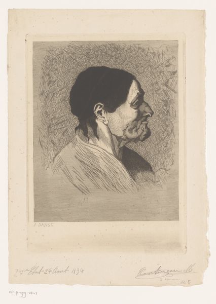 Editor: Here we have Henri-Charles Guérard’s "Head of a Woman," an etching and mezzotint print from around 1888. I find it strikingly simple, yet the details are captivating. What’s your take on this portrait? Curator: It's crucial to consider the material reality behind such a seemingly simple image. Guérard’s choice of etching and mezzotint – laborious, indirect processes – tells us something about artistic production in the late 19th century. These printmaking methods were increasingly accessible but still required skill. How might that affect our understanding of "originality" versus reproduction at the time? Editor: That’s interesting! So you're suggesting that the medium itself challenges traditional notions of art? Curator: Precisely. The very nature of printmaking is reproductive. And we see Guérard using intaglio techniques. Mezzotint, particularly, with its roughened plate surface creating velvety blacks, and etching allowing fine lines from acid biting into the metal... It shows an engagement with materiality. Don’t you think these textures, born from industrial processes, add another layer to our interpretation of this woman's portrait? Where does this fit with impressionism? Editor: I see what you mean. Maybe he's not just depicting a woman, but also highlighting the means of artistic creation itself, and challenging that notion of the fine arts vs craft or design.. Curator: Exactly! Guérard prompts us to investigate labor, and re-evaluate material transformation as its own form of representation. Editor: Thanks, this has given me a new way of thinking about not just this image but printmaking as a whole. Curator: My pleasure. Looking at art this way—focusing on materials and method—opens up entirely new avenues for analysis.