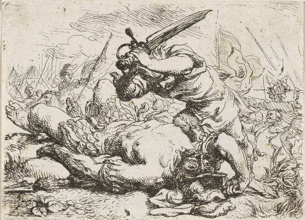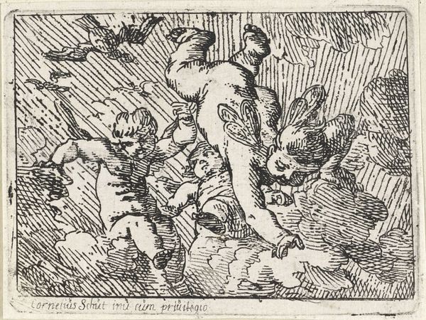 Curator: Look at this etching, "H. Franciscus ontvangt de stigmata," dating back to 1660-1680, currently held in the Rijksmuseum collection. It’s credited to Marcantonio Bellavia. My first reaction is how striking the level of detail achieved through engraving and etching is. Editor: The first thing that strikes me is the abject vulnerability, etched quite literally into St. Francis's pose. The man is receiving a divine wound and seems far more burdened than blessed. There’s a bleakness here that stands out. Curator: Yes, that vulnerability is quite telling. Viewing this within its historical context, such imagery of St. Francis receiving the stigmata served not just as a narrative scene but as a reinforcement of the Franciscan order's sanctity, and that of the Church as a whole. The emotional depiction encouraged religious devotion. Editor: Absolutely. And when we examine the means through which that devotion was achieved – the intense labor involved in creating the printing plate, the skilled application of acid to bite into the metal, it really underscores the Church's investment in projecting that specific message. Even something like the line quality-- it’s really consistent which suggests that Bellavia had high quality tools, the work and material was all highly coordinated. Curator: Consider also the broader culture of printmaking at this time. Prints had the unique role of being both artistic objects and vehicles for disseminating ideas to a wider public than painted works might reach. Bellavia, while lesser-known today, played a role in that wider cultural communication, solidifying religious teachings throughout communities near and far. Editor: And what is so powerful about that proliferation of the image of St. Francis— the stigmata themselves, visualized here, become tools of faith. Each print becomes an artifact, and then it points back to the complex relations between material, work, and production for a spiritual entity that wants and depends on control to succeed. Curator: Indeed. Bellavia's creation does more than just show the St. Francis narrative. The image serves as another object that propagates not just faith, but Church doctrine and dominance throughout the world it served. Editor: I appreciate having looked closer. It is a fascinating reminder of the intricate dance between materials, labor, faith, and power. Curator: Indeed. This print offers us valuable insights into the cultural and religious landscape of its time, through one image that captures that historical snapshot.
