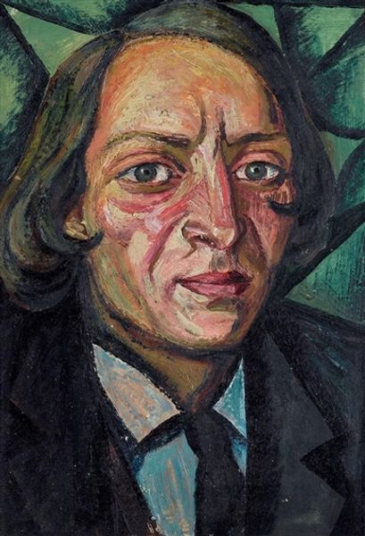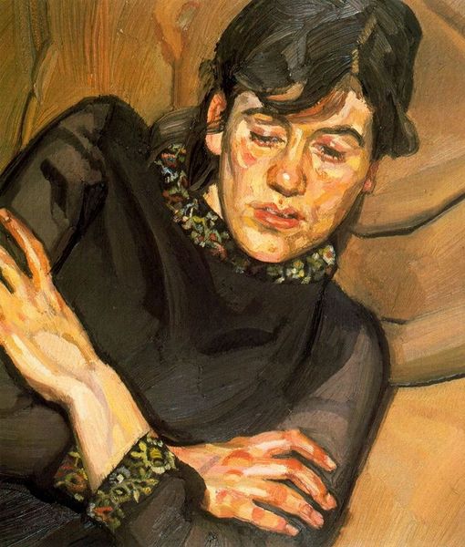 Editor: Lucian Freud's "A Woman Painter," painted in 1954 using oil, presents such an intense gaze. What strikes me most is the unvarnished realism—it’s compelling but also a little unsettling. How do you interpret this work within the art world’s broader history? Curator: It’s important to consider the social context. Post-war Britain saw a move towards realism, a rejection of pre-war romanticism. Freud, by painting his subjects with such unflinching honesty, challenged idealized portrayals of women prevalent in art history. Think about the power dynamics inherent in portraiture, who traditionally controlled the gaze? Editor: So, by presenting this woman without embellishment, he's subverting that traditional dynamic? It's almost like he's refusing to flatter her, showing her exactly as she is. Curator: Exactly. And who was this "Woman Painter"? The title itself is interesting; he’s not identifying her specifically. Perhaps, by generalizing, he’s making a broader statement about the role of women artists in a male-dominated field, and challenging institutional biases of the time. Do you find anything revealing in her attire? Editor: It’s just a simple dark turtleneck. Functional, almost like a uniform. It suggests a focus on her work rather than on projecting a certain image. Is that linked to the socio-economic changes following the Second World War? Curator: Absolutely. Austerity and a changing social landscape influenced artists to prioritize substance over spectacle. Her practical clothing might symbolize a shift in values, emphasizing artistic labour. This reflects a democratisation in the art world. Do you see a narrative in her face? Editor: I see determination, maybe even a hint of defiance. Seeing the piece in this historical context really shifts how I see this piece! It’s less about an individual portrait and more about the public role of female artists. Curator: Precisely. Analyzing it within its socio-political environment allows for a deeper engagement, highlighting how Freud’s art was part of this shift in power. Editor: I never thought about a painting being involved in a conversation about socio-political roles! Curator: Well now you have a taste of the complexity that can shape art and what the message implies.