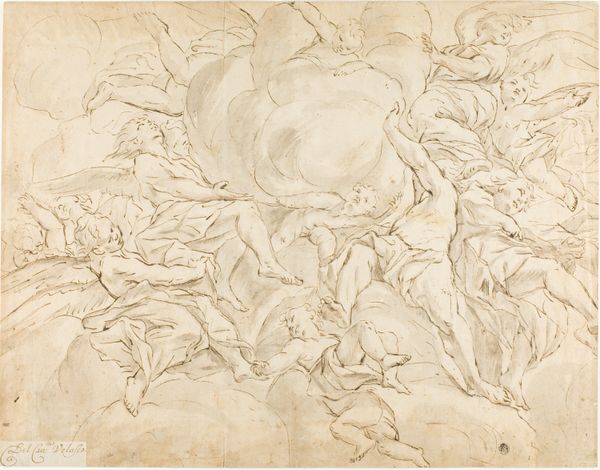 Editor: So, here we have "The Triumph of Truth Over Heresy," an etching by François Boitard from around 1710. There’s such dramatic energy in the composition. What grabs you when you look at it? Curator: Immediately, I consider the sociopolitical context of imagery like this. Visual rhetoric during this period was powerfully intertwined with religious and political power. Consider the term "Triumph." How does the imagery reinforce prevailing hierarchies and suppress dissenting voices? Editor: The angel wielding a sword and the figures contorted in distress definitely suggest a hierarchy! But who were the audiences for these images? Were they meant for the public or circulated in more exclusive circles? Curator: Both! Prints were relatively accessible, allowing these ideologies to reach a broader audience than, say, a large-scale history painting in a royal court. Etchings also circulated amongst the elites, solidifying a particular understanding of power and orthodoxy. Notice how Truth is idealized, while Heresy is demonized. Do you think the drawing's composition adds to the message of “triumph?” Editor: I think the way Truth literally towers above the other figures visually establishes dominance, as does her placement in a cloud of cherubic faces. Knowing its function as political and religious propaganda gives it a different edge, right? Curator: Precisely. Understanding its role within the visual culture of the period sheds light on how it worked to shape and reinforce the era’s beliefs. The dissemination of imagery impacts perception, a truth even in our contemporary times. Editor: It’s unsettling how clearly the artwork embodies that historical manipulation through propaganda, making it still resonate in the modern-day. It emphasizes how an awareness of these underlying narratives can add a critical layer to viewing artwork today. Curator: Indeed. We must consider these works in context to fully appreciate their impact, especially since its rhetoric is far from ancient.