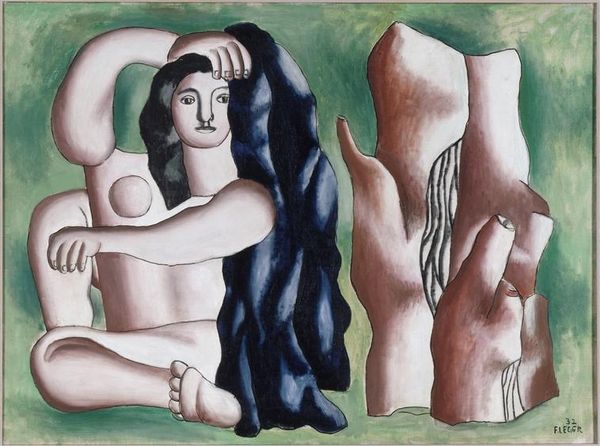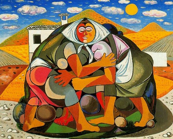 Editor: This intriguing oil painting, "King and Queen" by Jules Perahim, presents us with an unconventional landscape, wouldn't you say? I'm struck by the surreal figures and the unsettling serenity of the scene. How would you interpret this piece within its historical context? Curator: It’s important to recognize Perahim's socio-political milieu, specifically the Romanian avant-garde and his engagement with leftist politics. This painting may not portray royalty in the traditional sense but uses symbols and imagery to reflect on power dynamics and social hierarchies within his historical framework. Consider how the simplification of forms and the near-expressionless faces evoke a sense of alienation and perhaps a critique of the ruling class. Do you see how the positioning of figures relates to the landscape and what that could signify? Editor: I do see that! The figures seem almost part of the landscape, blending in but also standing apart. It makes me wonder if the artist is trying to convey the power of nature against social constructs. Is the “King” and “Queen” an ironic representation of these power dynamics? Curator: Exactly! Perahim's subversive stance likely employed symbolism to both conceal and reveal his political commentary, navigating censorship and public sentiment. The title, "King and Queen", could represent a deliberate attempt to provoke viewers into questioning established societal norms and authority figures of his time. How might contemporary viewers perceive these symbols compared to those living through the socio-political circumstances of its creation? Editor: That’s fascinating. Understanding the political undertones makes the painting far more impactful. I initially saw it as dreamlike, but it’s clearly a coded commentary on social and political tensions. Curator: Precisely. This highlights how our understanding of art is enriched by historical analysis, shaping its public role. Now you’ve provided an avenue into perceiving beyond mere aesthetics to acknowledge art's socio-political potency! Editor: Absolutely, this exploration revealed how "King and Queen" isn’t just a visual piece; it’s a historical document with symbolic challenges. Curator: A crucial insight into engaging with art as more than just imagery, but rather, sociopolitical engagement.
