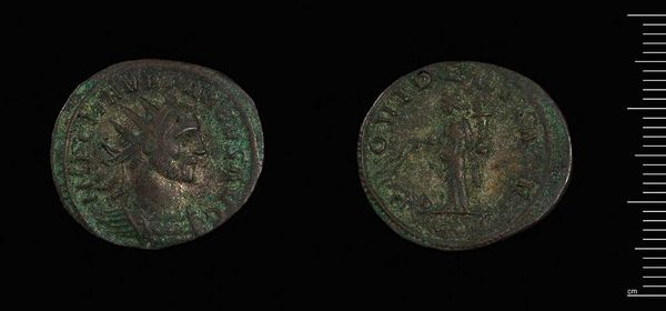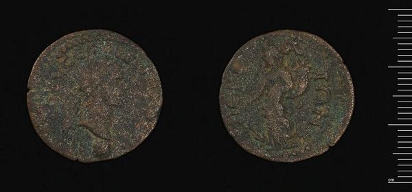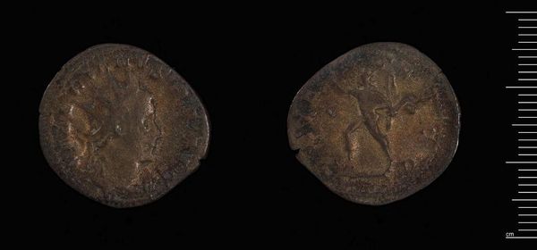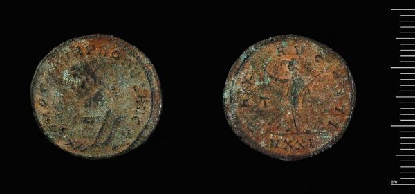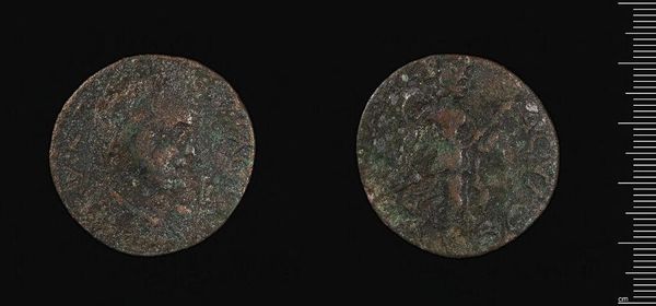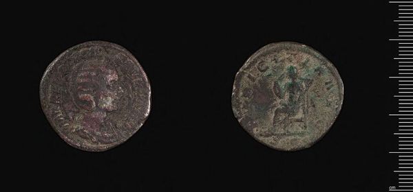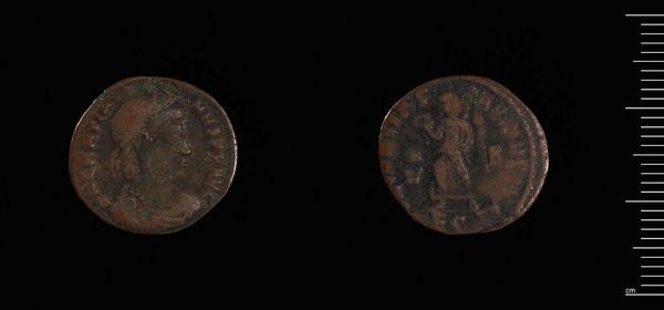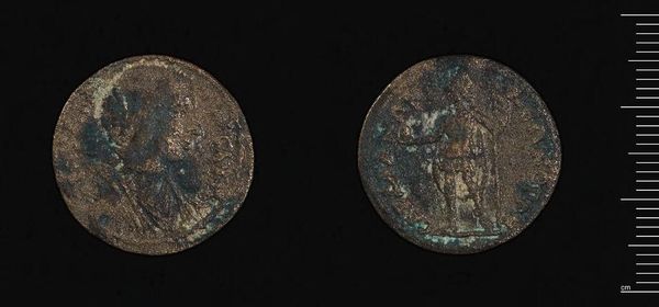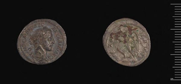 Editor: Here we have a coin of Apameia-Myrleia under Gallienus at the Harvard Art Museums. It's such a small object, yet the details are incredible. What strikes you about its composition? Curator: The coin presents a fascinating study in relief and texture. The obverse, presumably depicting Gallienus, shows an attempt at classical portraiture, though the erosion obscures precise detail. The reverse seems to depict a figure, possibly Nike, rendered with a linear precision at odds with the deteriorated surface. Do you observe any similar techniques at play? Editor: Yes, the lines create a dynamic figure, but the wear makes it hard to discern specific details. It makes me wonder what the artist intended us to focus on. Curator: Indeed. The coin's physical degradation, while obscuring the original details, paradoxically reveals the materiality and temporality inherent in the object itself. It moves beyond simple representation. Editor: That’s a really interesting way to look at it. The wear almost becomes part of the art. Curator: Precisely. It's a dialogue between the artist’s intent and the ravages of time. Food for thought, wouldn’t you agree?