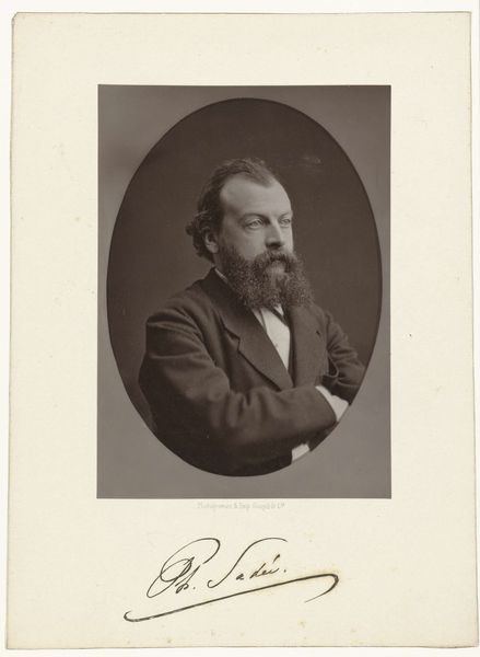 This is a portrait of Herman ten Kate, made by Maurits Verveer. The sepia photograph presents a man with a distinguished beard, arms crossed, framed by an oval backdrop. The composition emphasizes a structured formality. The use of light and shadow, creates a sense of depth. The photograph's visual elements suggest a desire to capture not just likeness, but also status. The subject's controlled posture and gaze, combined with the monochrome palette, evoke a sense of reserve and authority typical of the era. It's not just a representation of an individual; it's a constructed image designed to convey certain social and cultural values. Consider the cultural codes at play here. How does this image reflect the values and expectations of its time? This photograph becomes a site where ideas about identity and representation intersect. Its historical and cultural meanings, are constantly being negotiated and reinterpreted.