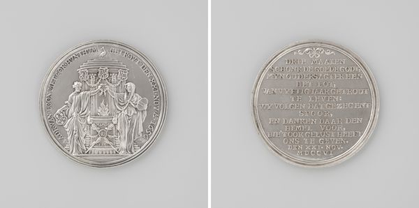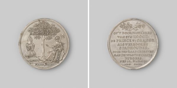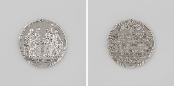 H. de Meyer created this silver medal to commemorate Prince William V's inauguration as hereditary stadtholder of the province of Utrecht. The medal presents the complexities of power and representation in 18th-century Dutch society. The allegorical figures on the front, likely representing virtues or provinces, stand as idealized symbols of the era's aspirations. They also show how the ruling elite used symbolic imagery to legitimize their power and project an image of stability and prosperity. The medal was gifted to the citizens of the 't Fortuyn company by their officers. This act can be seen as a gesture to foster loyalty and reinforce social hierarchies within the community. The medal not only commemorates a political event but also highlights the intricate relationships between rulers, officers, and citizens. This piece invites us to reflect on the ways in which power is negotiated, represented, and experienced at different levels of society.