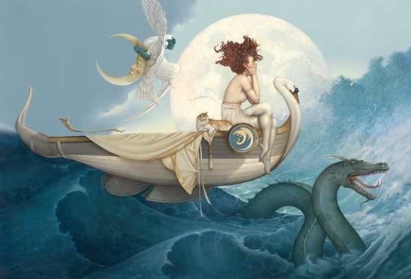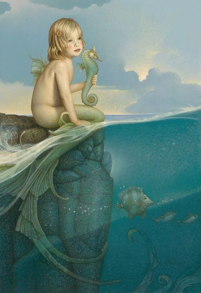 David Michael Bowers painted "Finding the Gold II," presenting a mermaid in her underwater realm, holding a glass bowl with goldfish. The work invites us to consider the historical and cultural narratives surrounding mermaids, often depicted as alluring yet tragic figures. Here, the mermaid is not simply a creature of myth but a figure of contemplation. What does it mean for her, a creature of the sea, to hold captive goldfish, symbols of domesticity and artificial environments? The image creates a dialogue about captivity and freedom. The mermaid's gentle expression as she gazes at the goldfish evokes empathy, blurring the lines between captor and captive, nature and artifice. "Finding the Gold II" prompts us to reflect on our relationship with the natural world and the ethical dimensions of containment.