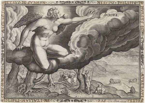 Curator: This engraving, titled "Dageraad," created in 1582 by Johann Sadeler I, captures a classical scene, doesn't it? The embodiment of dawn sweeps across the sky. What is your immediate response to the artwork? Editor: It feels dense, intricate. All those tiny etched lines creating so much detail, but in black and white it reads a bit…oppressive? The landscape is populated with many laborers doing the usual early work. What meaning do you draw from such detailed iconography? Curator: Sadeler masterfully layers classical allegory. Aurora, the goddess of dawn, literally ushers in the sun. Note how she emerges from darkness, bringing light—symbolizing hope and the commencement of daily labors. Her very form encapsulates potentiality. And even some of the people at their everyday work have allegorical meaning, when combined with Aurora. Editor: So, in terms of production, consider the sheer labor that went into this single print! Each line etched by hand to build the image, and then multiplied through printing. You mention layering – even the making mirrors that! A repetitive process transforming base materials into multiples – this engraving has served more purposes and laborers throughout its lifespan! It begs the question: where and when was this viewed, handled, or put to work? Curator: Excellent point! Its cultural impact ripples outwards, embodying and reinforcing classical ideals, while at the same time acting as an important symbol of the value of early morning industriousness for its audience. What do you consider to be this piece's most relevant legacy? Editor: Its legacy for me resides in the material trace of repetitive labor: from the artist to the countless prints dispersed. Each labor leaves a faint mark and has been affected by environmental labor and other contexts over the decades! I also see that a later hand inscribed words around the artwork… what kind of value and life have they had? Curator: Intriguing how these observations enhance its complex meaning for me; considering material value changes over time.