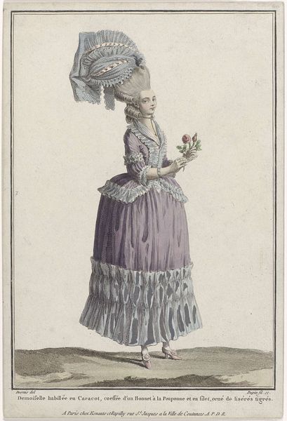 Dieu de Saint Jean created this print of a fashionable woman, using etching and engraving techniques on paper. The coloring was added later, no doubt by hand, bringing a lively quality to the composition. Consider the title – “A woman of quality in summer undress.” This isn’t just a portrait; it's a carefully constructed image of status. The very act of producing such a print speaks to the growing culture of fashion and consumption in the late 17th century. The textiles and clothing depicted would have been produced by skilled artisans, with considerable labor involved in the creation of the lace, embroidery, and tailoring. The fan she holds would have required additional labor to decorate. In essence, this print encapsulates the interconnectedness of art, craft, and commerce during the early modern era. It blurs the boundaries between these categories, inviting us to reflect on the skilled workmanship behind even the most seemingly frivolous of consumer goods.