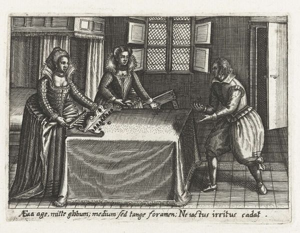 Curator: Jacob van der Heyden’s etching, “Dwaze man wordt door de barbier ontdaan van de nar die uit zijn hoofd groeit,” created in 1608, presents a fascinating scene. I’m immediately drawn to the composition's theatrical feel. The meticulous details, rendered in black and white, evoke a curious blend of comedy and unease. Editor: This work visualizes the relationship between knowledge, madness and social order, very important themes at the turn of the 17th century. We see the 'fool' undergoing a surgical procedure, as the barber attempts to excise a literal fool's cap growing from his head. It's a stark commentary on societal pressures to conform, and the pain inherent in such transformation. Note how other figures surround him. The action suggests a broader socio-political theater, the barber becomes the tool of the system. Curator: Yes, the dynamic poses create a strong visual tension! I want to focus on how light and shadow carve out form and how van der Heyden masterfully guides our eye through the image. Notice how the placement of the window creates light in the back and the characters in the front almost dance around that light. And I see some dolls under the table in the forefront, these figures repeat throughout the composition. Do they play any role? Editor: Precisely. The dolls underfoot, like discarded aspects of the self, highlight the fragmentation involved in suppressing individuality to accommodate societal expectations. In considering power dynamics at play, we cannot ignore that the action takes place at the expense of a single man at the mercy of social norms and a very busy barber. In this manner, it anticipates the work of Foucault and poststructuralists who interrogated the relationships of power in our everyday lives. Curator: Indeed, I see this etching as van der Heyden employing skillful, Baroque lines to question these very mechanisms of societal control. Editor: I agree. Considering these different angles allows for an expanded experience of the artwork’s original setting.