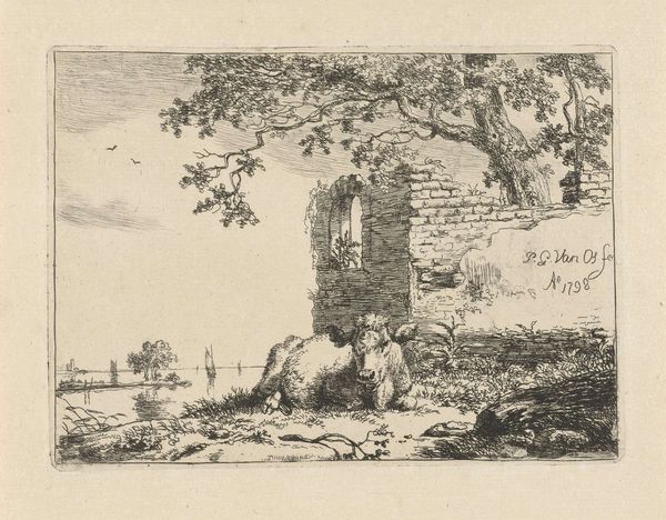 Curator: Here we have an etching by an anonymous artist dating from somewhere between 1798 and 1848 titled “Liggend kalf voor een ruïne,” which translates to “Calf Lying Down Before a Ruin.” Editor: Oh, the light! It's that delicate touch, barely there, and yet it gives everything such a still, summery quality. Curator: The artist employed the intaglio technique. Look closely and you'll observe that the image is incised into a metal plate. Acid does the biting to create those lines and when it’s filled with ink, pressed, it transfers to paper. You can see this attention to process across multiple landscapes of that period, where farmers sought new efficiency of production while cities like Amsterdam decayed or even boomed in ways that could appear decadent to the rural eye. Editor: I'm intrigued by this gentle positioning of life and ruin – a lazy calf nestled next to the remains of a bygone structure, nature almost embracing decay. There is a profound sweetness, isn’t there? Curator: These artists, even when "anonymous", were incredibly skilled craftspeople. It prompts reflection on labor itself, as if they are silently documenting both sides of labor in production; on one hand are farming efforts to grow the land as seen with this calf, while another, like the stone cutters and builders whose time passed building those ruins, seems more forgotten. It almost questions the idea of progress. Editor: Progress or the fleeting nature of all things. Makes you wonder what future eyes will make of our concrete jungles someday... a crumbling testament to a civilization’s follies, I imagine, overgrown with tenacious vines and curious animals. It’s as if time itself becomes a canvas here. Curator: Perhaps. And how our means of representing, reproducing, and disseminating visual art shapes what, where, and when we perceive meaning. Editor: I appreciate the image for its reflective nature on life's transient beauty, but equally, your focus highlights the art and time embodied by these techniques. Curator: A poignant reflection, if I may say so myself. Editor: Agreed. The printmaker offers us much to see... and to feel.