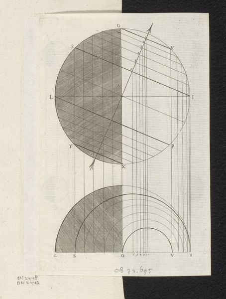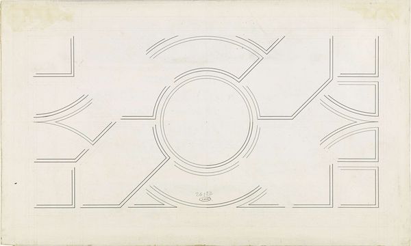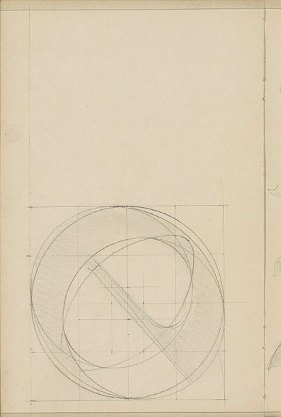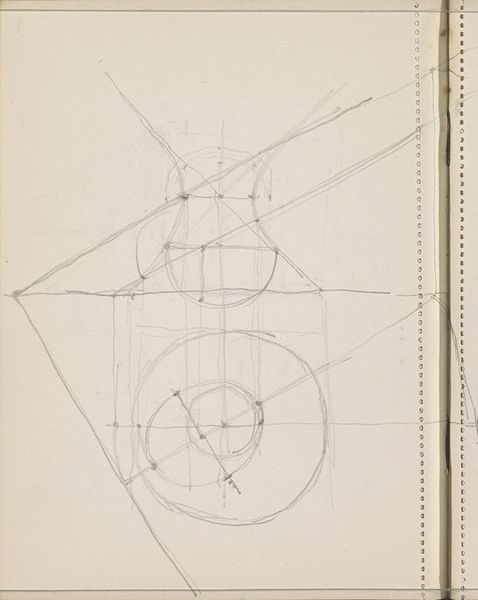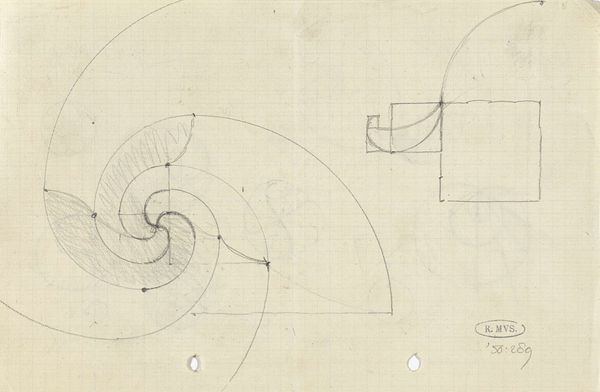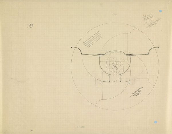 Curator: At first glance, this pencil drawing appears quite technical, almost like a blueprint. It’s precise but delicate. Editor: Indeed. What we have here is "Ontwerp voor een zilveren fruitschaal," or "Design for a Silver Fruit Bowl" attributed to Mathieu Lauweriks and created sometime between 1874 and 1932. It's a fascinating example of Art Nouveau intersecting with geometric abstraction. Curator: Abstraction feels like the right word. I see a spiral pattern built upon squares, very precisely rendered on what appears to be graph paper. The interplay of line, form and geometric precision, must have dictated every step of the fruits bowl construction process. It feels as though Lauweriks is trying to merge hand-crafted design with the growing industrial aesthetic of the time. Editor: Exactly. Consider the period. Lauweriks was working at a time when industrial production was rapidly transforming society. Artists and designers were grappling with questions of how to reconcile craftsmanship with mass production. His work demonstrates an ambition to imbue even functional objects, such as a fruit bowl, with higher mathematical principles and artistry. Curator: I’m intrigued by the use of silver, or at least, the plan to use it. Silver carries such historical weight. Beyond being an ornamental material with links to the decorative arts, using a valuable material adds another layer to the socio-economics implications and value of making. Was this intended for an elite clientele or was it meant to be a more accessible piece? Editor: That’s a key point. Silver, of course, signified luxury and refinement, placing this theoretical fruit bowl within a specific socio-economic context, likely aimed toward the emerging bourgeoisie who sought to elevate their status through decorative objects. The politics of consumption and the accessibility of beauty was clearly at stake for those early practitioners of modernism. Curator: I agree, and the careful labor reflected in each meticulous pencil stroke highlights a commitment to craftsmanship, in spite of this movement towards industrialization. Each deliberate geometric line conveys a clear vision from design to final form. Editor: Precisely. The drawing provides a window into how ideals around beauty and functionality were actively being negotiated within the context of the economic landscape of his time. It reveals this tension between hand-craftsmanship and mechanical production as the artist bridged high design with common form. Curator: Seeing that intersection of the geometric and luxurious is truly fascinating and makes me consider how such everyday things take on such a profound cultural significance. Editor: Indeed. And reflecting on the design of a silver fruit bowl through a historical context challenges our conventional separation of aesthetics, economy and society.