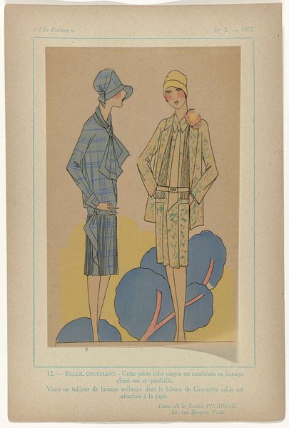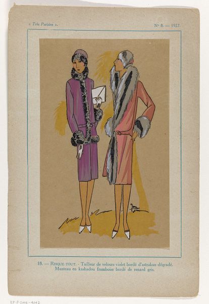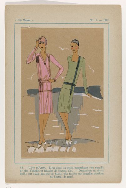 Editor: So this watercolor drawing, "Tr\u00e8s Parisien, 1927, No. 3," by G-P. Joumard, features two women in what I assume are Jean Patou designs. I'm immediately drawn to the clean lines and the somewhat subdued, yet stylish mood. What strikes you most about it? Curator: The immediate effect for me is the echo of modernity through familiar forms. Note the repeated vertical lines in the dresses, suggestive of classical columns. This echoes an underlying stability even as hemlines rise. Consider too the turbans – while fashionable, they also speak to the period's fascination with the orient, which carries a whole weight of colonial exchange. Editor: That's fascinating! I hadn't considered the "orient" reference. How do the clothes express this specific historical moment? Curator: In 1927, fashion was signaling change. We're post-war. Women’s roles shifted. Patou and others visually negotiated tradition against modern practicality and expression. How is gender performed through this clothing and for whom? Note also the relative lack of ornament, yet a great deal of detail - these were expensive garments but understated. This piece presents ideas about female independence and modern identities through style, while subtly nodding to classical roots, embedding complex tensions in an ostensibly simple fashion plate. What do you make of their interactions in the scene? Editor: It’s as if the artist has composed a complex narrative without telling the full story. They’re positioned together, but they also seem disconnected. Thanks, I learned a lot about how clothing conveys ideas about shifting cultural values. Curator: Indeed! There is a powerful silence that permeates the whole composition; perhaps a mirror reflects both a surface and the complex narratives that are stitched within it.