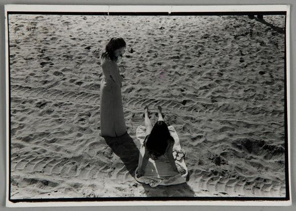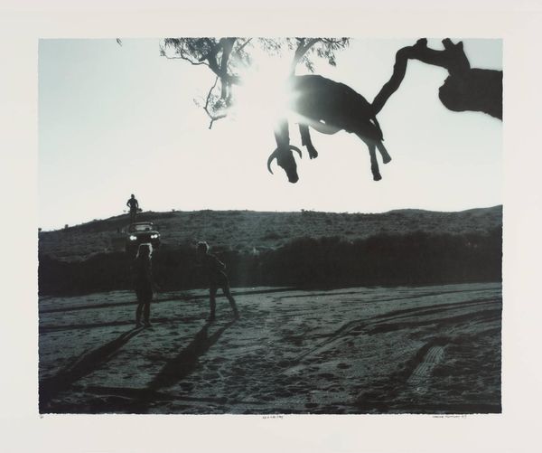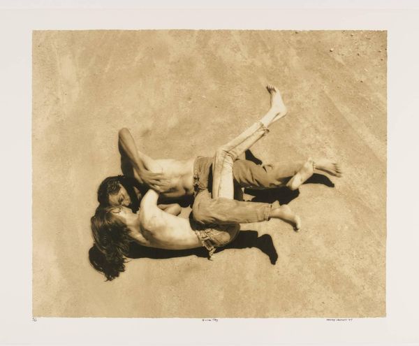 Editor: This evocative, untitled photograph by Tracey Moffatt captures a couple wrestling in a barren landscape. It feels strangely staged, even voyeuristic. What do you make of its social commentary? Curator: Moffatt often explores themes of displacement and societal expectations through constructed narratives. The stark landscape and isolated figures could symbolize societal alienation or the performance of relationships under scrutiny. Consider how the image's composition and sepia tone contribute to this narrative. What power dynamics might Moffatt be highlighting? Editor: That's insightful! The voyeuristic angle adds another layer, suggesting we're complicit in observing this staged intimacy. Curator: Exactly. Moffatt uses familiar visual languages to question how cultural narratives are constructed and consumed. We become aware of our own role in perpetuating those narratives.