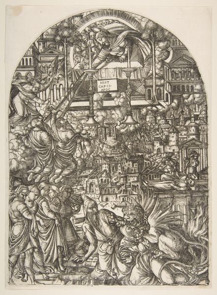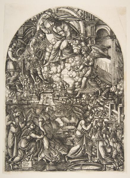 Curator: Let's turn our attention to this remarkable engraving by Jean Duvet, crafted between 1546 and 1556, entitled "The Winepress of the Wrath of God." Editor: My first impression is one of overwhelming intensity. It's a dense composition, packed with figures and activity, conveying a sense of chaotic energy. The stark black and white imagery really heightens the drama. Curator: It’s a powerful visual representation of a rather terrifying biblical metaphor, wouldn’t you agree? Duvet really leans into the imagery derived from the Book of Revelation. Note how the figures are arranged in distinct registers: celestial beings above, a ravaged earthly plane below. There is also the strong symbolism, most obviously centered on the idea of grapes being pressed, yielding the wrath of divine judgment. Editor: Absolutely. That duality between heaven and earth, innocence and punishment, it resonates even now. Looking at the lower register, with figures toiling at this gruesome winepress, one can't help but consider contemporary forms of exploitation, how some people’s labor literally "presses" others to their limits, all while elites prosper. It reminds me of Silvia Federici's work on the witch hunts. Curator: An interesting parallel to draw. Duvet worked during a time of enormous religious upheaval, of course. This work isn't just about any oppression; it speaks directly to spiritual authority, reflecting a very specific vision of the end times, heavy with symbolic weight. We must consider what an important and sensitive symbolic and psychological role that played. Notice too how the angel holds scales: a constant symbol throughout civilization as balance and impartiality. Editor: While acknowledging its historical context, I find that "balance" deeply problematic. It begs the question: whose vision of justice? And is wrath really justifiable, no matter the context? It forces us to examine power structures inherent in even the most sacred narratives and challenge ideas about inherent moral authorities. Curator: It’s undeniable that the engraving possesses this compelling intensity; it challenges us, and prompts further interrogation beyond its historical setting. Editor: Exactly. This artwork is definitely not a passive historical document. It can serve as an active touchstone for dialogue about injustice. It can enable us to confront persistent inequities both in the past and present.