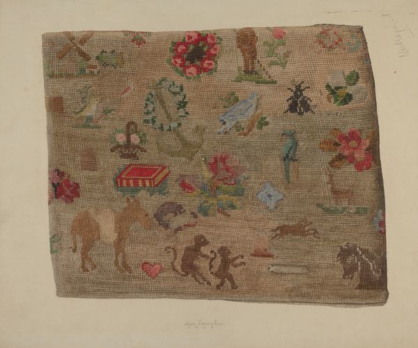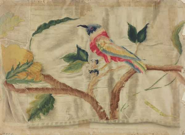 Lawrence Peterson made this embroidered petticoat border, but we don't know exactly when. What's immediately striking is the pastoral scene, featuring deer, dogs, and a variety of stylized flora, offering a glimpse into the tastes and preoccupations of its time. Likely created in the late 19th or early 20th century, this piece reflects a broader Arts and Crafts movement trend that emphasized handcraftsmanship in response to industrialization. Embroidery, traditionally a domestic activity, gained new artistic recognition and was an acceptable creative outlet for women in particular. The imagery itself harkens back to idealized rural life, a common theme in art as societies became more urbanized. Understanding this work requires considering the social status of textiles, the gendered division of labor, and the longing for a pre-industrial past that defined the cultural landscape of Peterson's time. Further archival research into textile production and the Arts and Crafts movement may shed even more light on this lovely piece.