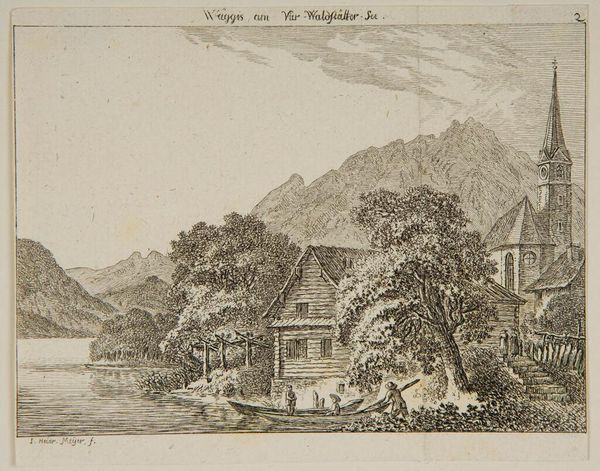 Curator: Looking at this image, "Oberwyl on Lake of Zug" by Johann Heinrich Meyer, it strikes me as a really peaceful, meditative landscape. What is your first impression? Editor: It feels a bit…clinical, almost? The precision of the lines, the stark contrast. It’s like a cartographer's record of the sublime, not a painter's embrace of it. Curator: I get that. Meyer, who lived from 1680 to 1752, probably saw the landscape as something to be carefully documented, cataloged even. It’s interesting how social priorities shaped how art was perceived. Editor: Exactly! This is landscape as property, as resource. The mountains loom, but it's really about taming nature, organizing space. But at the same time, there's a raw beauty that peeks through those etched lines. Curator: I agree, even through the precise lines, I think, there is still a sense of awe conveyed within the grandeur of the mountains that rise behind the buildings on the shoreline. Editor: So, ultimately, a lovely tension between control and untamed nature.
