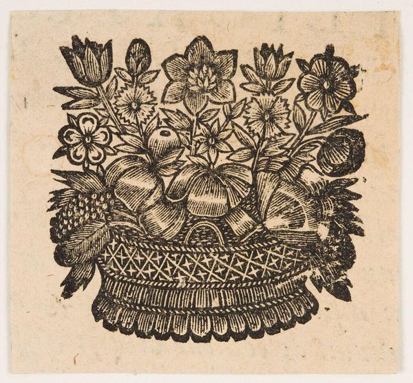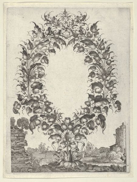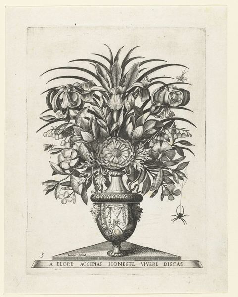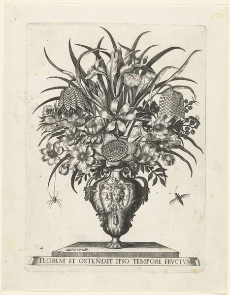 Editor: Here we have an engraving from somewhere between 1500 and 1600 called "Groteske vaas met drie mascarons," or Grotesque vase with three masks, by an anonymous artist. The detail is incredible, particularly on the vase itself! I find the whole thing slightly unsettling, though. How do you interpret this work? Curator: The grotesque, with its combination of the beautiful and the monstrous, was a popular motif during this period. How might we view its popularlity in the art market and socio-political life of the time? The printmaking medium itself facilitated the dissemination of such images and ideas across a wider audience. The printing press amplified the distribution of ideas. This vase isn’t merely decorative; it actively *performs* meaning through those grotesque faces and floral symbols, like memento mori. Editor: Memento mori, a reminder of death, okay. So the flowers are like a symbol of mortality here? Curator: Exactly. And think about the Latin inscription at the bottom, “O flos sic vernans iuvenili aetate pudorem” -- “O flower thus blooming, modesty of youthful age.” This connects the fleeting beauty of youth to the ephemeral nature of the flowers. So it's a complex reflection on morality but within a socio-cultural landscape of a powerful church and state apparatus. Editor: The snail and the fly seem like they would play into this idea, too, right? Curator: Precisely. Details like the snail and the fly, so meticulously rendered, might refer to decay and the passage of time. Do you see how they're not merely aesthetic choices, but are potent symbols speaking to the era's understanding of life and death? It shows the impact the Church had at the time, doesn’t it? Editor: It definitely makes you think about the fleeting nature of beauty. The vase makes sense, now that you mention that everything is connected. The more people saw and discussed these prints, the more influential the artwork would become. Curator: Indeed, this engraving invites us to consider the intricate connections between artistic production, the dissemination of ideas, and socio-political ideologies, reminding us of art's vital role in shaping societal perceptions. Editor: I’ll definitely never look at floral art the same way again! Thanks for unpacking this piece with me!