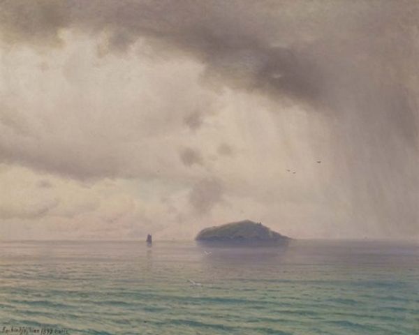 Editor: This is William Bradford's *Rainbow over the Arctic*, a plein-air oil painting. I am struck by the harmonious blend of colors, a seemingly realistic landscape, that appears almost dreamlike. What strikes you when looking at this piece? Curator: What I find immediately compelling is the structural juxtaposition between the horizontal expanse of the sea and the vertical assertion of the rainbow. The artist seems interested in playing with balance and counterpoint, note also the two land masses. Are they twins? Rivals? The rainbow visually connects them but also bisects them. Editor: That’s a really interesting point. So, if the structure informs the whole, how does the painting explore light? Curator: Precisely! The artist has used light to create depth and atmosphere. Observe how the foreground is rendered in warmer, earthier tones, creating a sense of immediacy. While the sky transitions to cooler, more ethereal shades of yellow and blue, thus heightening the feeling of atmospheric perspective. The rainbow, a focal point, serves as a chromatic bridge, connecting these realms through a spectrum of pure hues. How do you feel about it as romantic art? Editor: That’s making me think, does the overall impression, this play of light, of shape, indicate the sublime, given how it elicits a potent and awe-inspiring response? Curator: The effect could very well point to the sublime and even touch upon notions of transcendence. Bradford doesn't simply represent a scene; instead, it elicits an experience through carefully orchestrating formal elements such as light, color, and composition. It evokes a contemplation about the power of nature. Editor: I now perceive that the visual structure facilitates deeper meanings. Thank you! Curator: Indeed, by analyzing the interplay of form and technique, we can decipher the complex semiotics embedded within the art piece.
