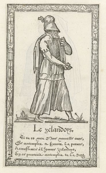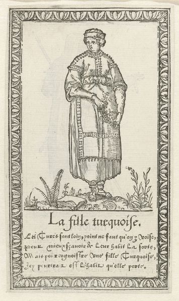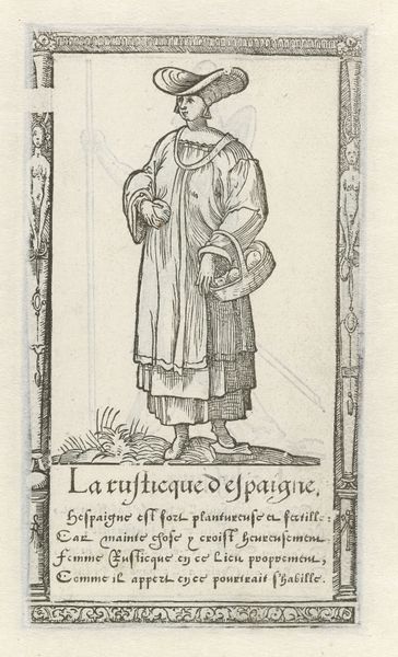 Curator: Looking at this, what springs to mind is a curious solemnity, despite the title "Vrouw uit Spanje met tamboerijn," or Woman from Spain with tambourine. The mood feels less festive than one might expect. Editor: It is interesting you pick up on the solemnity; it probably has to do with the fact that we’re seeing an engraving from 1562 by François Desprez, a medium demanding laborious precision. The depicted woman’s stance is so incredibly stiff and vertical. I wonder if her posture has something to do with its symbolic connotations for that period? Curator: Precisely, but also the crosshatching and how the linear strokes define and almost confine her. Her dress seems heavy, like it’s made of carved stone rather than fabric. Is this woman captured, or perhaps, burdened, by something larger than herself? And the tambourine isn't so much a joyous instrument here, but more of an object reflecting perhaps her soul or fate through the figures dancing inside it? Editor: What captures my attention is that she is quite literally holding in her hand not a scene of a woman but a dancing couple in the miniature and compressed world of the tambourine itself. The production of this print— the materials used and its potential consumption —also has this woman from Spain herself contained within its own material realities. Who might have bought this and where would it hang? Curator: Perhaps a traveler, or someone interested in the customs of foreign lands? I wonder if Desprez intended a romantic vision or a slightly critical, almost satirical one? Editor: The decorative border does make one feel transported to another land...I think Desprez is reflecting the tastes and fascinations of the consuming audiences during the late Renaissance. The meticulous nature of engravings in that era positioned it as something affordable, certainly reproducible, yet intricately made. Curator: Seeing the care he puts into each small crosshatched line truly adds to its charm, an essence that maybe mass production can steal. I find I’m even more taken by her contemplative stillness as the print's sharp details and symbolic resonance sink in. Editor: Right. The print really showcases how material limitations and cultural contexts intertwine, influencing both the artist’s choices and our contemporary understanding. The boundaries of 'art' versus 'craft' seem less firm when viewed through the lens of material history.