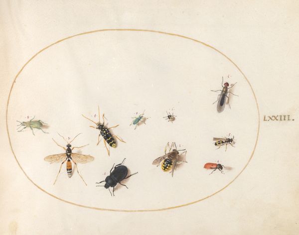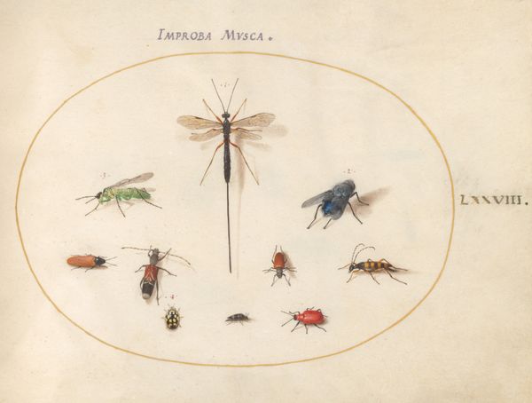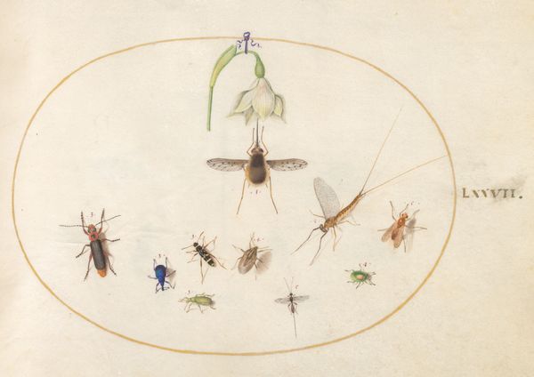 Joris Hoefnagel created this watercolor and gouache of various insects on paper sometime before his death in 1600. Hoefnagel, who served in the courts of the Habsburgs, approached natural history with an artist's eye, reflecting a period when art and science were deeply intertwined. His work emerges from a time of exploration and discovery; he sought to capture the intricate details of the natural world with a precision that mirrored the era's burgeoning scientific curiosity. Looking at this collection of insects, we might consider how each creature, rendered with such care, represents a facet of life's delicate balance. Consider the emotional depth of Hoefnagel’s work, he once noted that art, "should fill the mind with marvel". This plate invites us to reflect on the beauty and complexity of the natural world. It also subtly acknowledges our relationship to the environment, and the potential for both wonder and disruption.