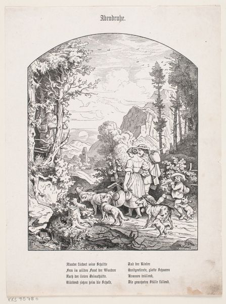 Editor: This is "Rest after Work" by Adrian Ludwig Richter. It's difficult to date exactly, but Richter lived from 1803 to 1884. It's a print, and it feels very... pastoral. What do you see in the composition that strikes you? Curator: The interplay of light and shadow is particularly striking. Note how Richter uses hatching and cross-hatching to define forms and create a sense of depth. Observe how the figures are arranged within the architectural structure to form a cohesive and balanced whole. Editor: I see how the lines create depth, especially in the foliage. Curator: Precisely. The strategic placement of dark and light areas guides the eye and contributes to the overall harmony. Consider, too, the geometry inherent within the composition. Editor: It's amazing how much detail he achieves with just lines and shading. I hadn't noticed all the geometry. Curator: It reveals a mastery of form and technique. This image exemplifies the formalist ideals of visual harmony and structural integrity. Editor: I appreciate your perspective! It really makes me see the work in a new light. Curator: Indeed. Close visual analysis allows us to appreciate the artist's intention and skill.