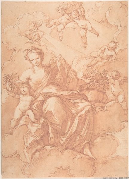 Curator: Today, we're examining "Madonna and Child Seated on Clouds," a drawing, and a print dating back to between 1637 and 1700, and currently residing at the Metropolitan Museum of Art. What's your first impression? Editor: Well, it's a familiar image, yet there’s an unexpected earthiness here. Despite being on clouds, there's a weight to their forms, to Mary's draped clothing... it’s as if holiness is brought down, grounded in reality, rather than floating ethereally. Curator: Interesting. Formally, it’s a study in contrasting textures and linear perspectives. The hatching defines form and space and plays with the interplay of light and shadow that create a tactile, volumetric understanding of Mary and Christ. Note how her gaze draws the viewer's eye. Editor: But what does that gaze mean within a 17th-century context? The Madonna’s placid face might speak to prescribed roles for women, specifically concerning piety and motherhood. How much agency is allowed in representing powerful female figures, and is the maternal always idealized to this degree? Curator: Her composure also evokes classical ideals, recalling ancient statues. The very deliberate use of line weight helps articulate this artistic influence. In a world dominated by religious commissions, artists frequently looked to antiquity for authority and grandeur. Editor: Yet the historical power dynamics can’t be ignored. This work, and others of its ilk, reinforce established hierarchies, portraying power – familial, social, divine - as fundamentally male-centric. How did contemporary audiences of diverse socio-economic backgrounds experience the artwork’s politics and values? Curator: Your point emphasizes a key facet of this era: power manifested visually. Considering its materials, this piece provided the masses accessible iconography due to the reproducibility of printed work, while serving an elite's visual tastes through classical imagery and compositional acuity. Editor: Seeing it today, it compels us to unpack its role, its history, its visual construction… to ask what this particular image of the Madonna and Child said, and continues to say about beauty, power, and faith. Curator: A testament to its continuing capacity for artistic and intellectual stimulation.