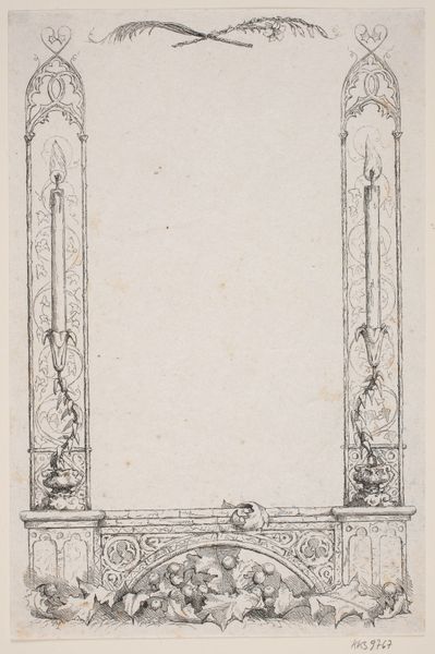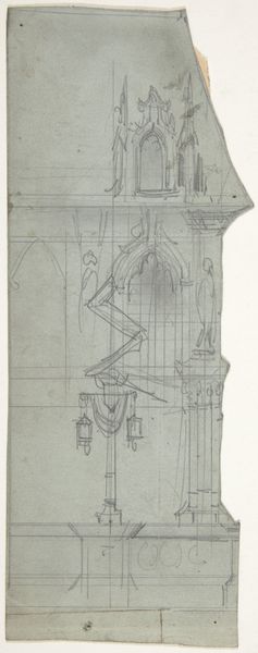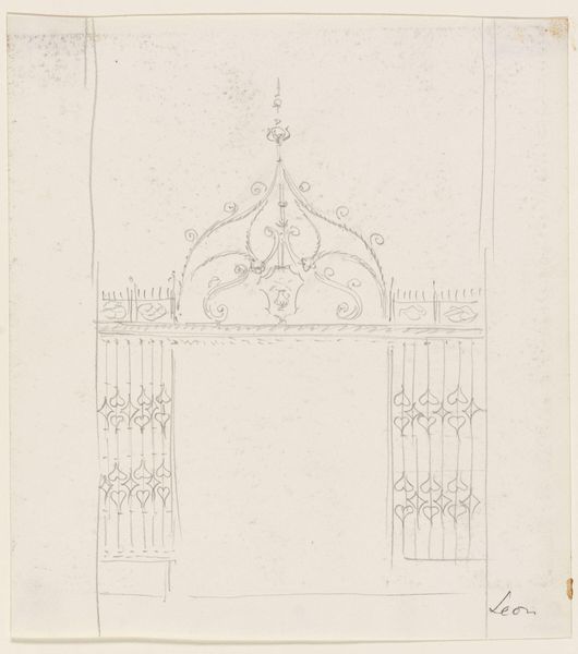 Curator: Here we have "Design for a carved pillar next to a doorframe," an architectural study rendered in pencil, dating from sometime between 1800 and 1900. Editor: It's so precise, almost ghostly in its clarity. Like an echo from a grand hall or maybe the whisper of a building that never came to be. I can almost hear the distant tapping of a mallet against stone. Curator: Yes, the medium conveys a sense of meticulousness. Notice the cross-hatching, indicative of depth, the subtle variations in line weight suggesting different textures and planes, the geometric arrangement. Semiotically, the pillar signifies order and permanence. Editor: Permanence, definitely. Yet, because it’s just a sketch, it’s fleeting too. I mean, all the curlicues and ornamentation—they're extravagant, but there's a melancholy air about them too, a wistful look into another time. The incompleteness. It leaves you wanting the artist's vision for color or any possible additions, what could have been and how the sunlight would have touched the work, finished. Curator: Indeed. The architectural language employed speaks volumes, does it not? The Corinthian capitals, though sketched, denote classical ideals. The rendering captures a transition in architectural design towards Neoclassicism. It presents a vision of ordered space. Editor: A space that needs some nature too, it feels. The pillar cries for some vibrant life like trailing vines. That rigid form wants some rebellious nature poking out and taking over to disrupt those geometries, right? It is almost as though these are all plans and no spirit and yet, looking closely at each line, there’s so much care. That human hand. Curator: Precisely! A dialogue, perhaps, between intention and form, freedom and function. Editor: A quiet ghost of possibility. A grand idea, simply caught.