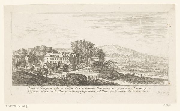 Editor: So this is "View of the Chateau d'Irrois" in Champagne, an etching by Israel Silvestre, made in 1651. The detail is really impressive, but there's also a sense of everyday life with the figures in the foreground. What catches your eye in this piece? Curator: I'm immediately drawn to the etching process itself. Think about the labor involved in creating those fine lines, the acid biting into the metal plate, the physical act of printing. It connects us to a whole workshop environment, not just the solitary "genius" of the artist. Editor: That’s a side I hadn’t considered! The figures suddenly seem more important, not just decorative. Curator: Exactly! Consider who these figures were, their relationship to the Chateau as a structure and a social institution, how the artist might be positioned relative to this society, how prints circulate and how people use them as a form of understanding social hierarchies. The print isn't just about the Chateau; it's a commodity that participates in a broader network of exchange and meaning-making. Who has access to it? Editor: That makes me think about how this image, multiplied through printmaking, makes this private property of "Monsieur le Marquis" much more widely "available," at least visually. Curator: Precisely! How does that affect the Chateau’s value, the Marquis’ status? The image becomes a tool. A tool for commerce? For propaganda? The material conditions of its making and distribution have concrete effects on society. It really makes you wonder, doesn’t it? Editor: I agree. Considering the materials and their implications, I'm viewing the etching with completely new eyes now! Thanks for this materialist lens. Curator: My pleasure! The art is never separate from the socio-economic forces that shape its production and consumption. It really deepens our understanding of the period.