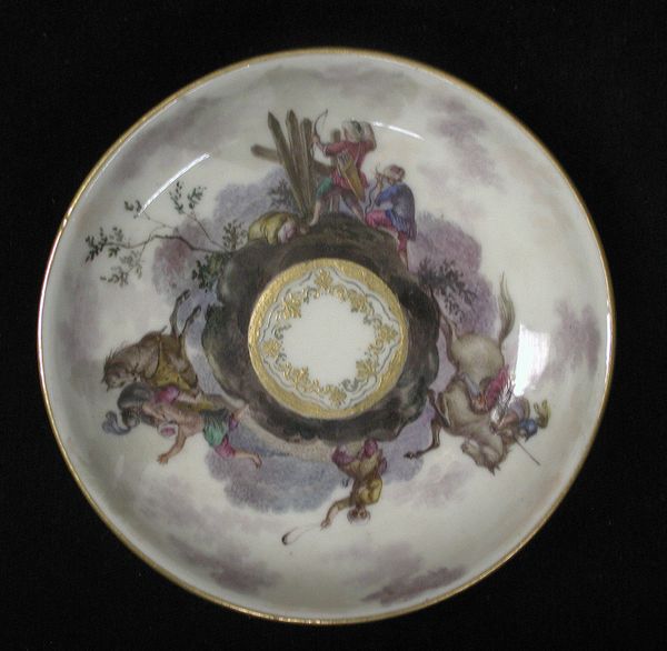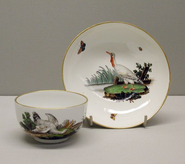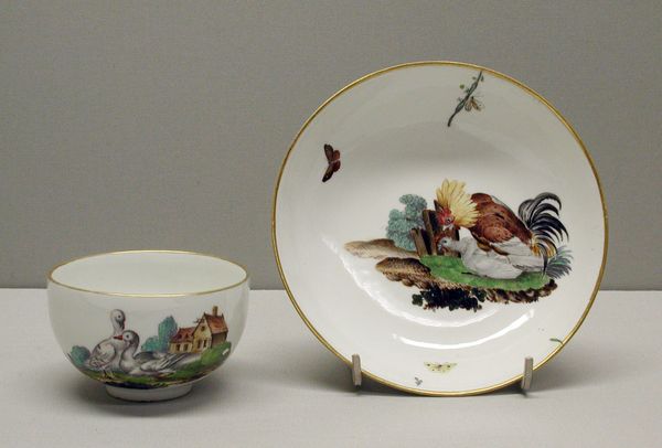 This delicate porcelain cup, made in Germany by the Gotha manufactory, speaks to the social rituals of 18th-century Europe. Porcelain, often called "white gold," was a prized material, and its use in tableware signaled wealth and refined taste. The cup and saucer are decorated with cherubic figures, rendered in a delicate pink. These images evoke a sense of playful innocence, a popular motif in Rococo art, which flourished in Europe during this period. Rococo, with its lighthearted and ornamental style, was closely associated with the aristocracy. The cup could have been used for enjoying beverages such as tea, coffee, or chocolate, which were increasingly popular among the upper classes. Historians consult design pattern books, trade records, and social etiquette guides to fully understand objects like this. These sources reveal how artistic styles were connected to social status, political power, and economic exchange. By studying this cup, we gain insights into the material culture and social practices of a bygone era.