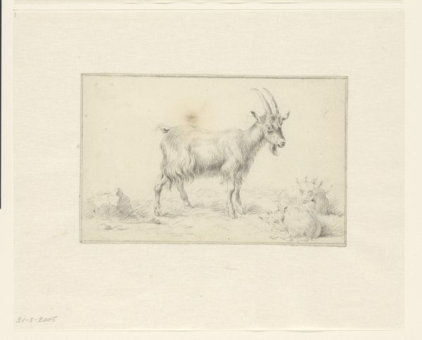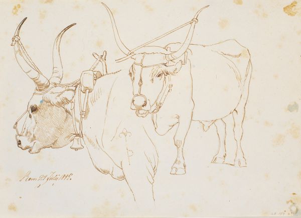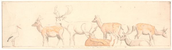 Editor: Here we have "Three Buffaloes Lying on the Forum" by Etienne de Lavallée-Poussin, likely created between 1750 and 1793. It's a lovely sketch done with pencil and watercolor, but what strikes me is the peculiar juxtaposition of these beasts within such an iconic setting. How would you approach an analysis of this piece? Curator: It's crucial to consider the materiality of the artwork first. The combination of readily available and relatively inexpensive materials like pencil and watercolor suggests that this was likely a preparatory study. Considering the means of production is also interesting here. Editor: A study? So it wasn't meant as a finished work itself? Curator: Possibly not. These materials allowed for easy transport and quick execution, essential for sketching from life or rapidly recording observations. The “genre painting” aspect reinforces this – depicting everyday scenes. The real question is why these buffalo in the forum? Is it an observation on the use, modification, or consumption of the space by others? Were these working animals? Editor: That's interesting. Perhaps it is not so much about the glory of Rome, but about the more quotidian aspects of daily life imposed on the Forum. Curator: Precisely. Consider also the labor these animals perform or the food they provide. The artist's choice to portray them resting forces us to confront this interplay between classical grandeur and agricultural pragmatism. Do the earthy materials themselves symbolize labor and earthly reality contrasted with the "high art" ideals of Rome? Editor: It certainly gives a different weight to this seemingly simple image. It's much more than a pastoral scene. Thanks for this alternative insight. Curator: Indeed, analyzing the artwork’s materiality unveils the socio-economic context, transforming what appears like a basic sketch into a multi-layered commentary on production, labor, and historical consumption.