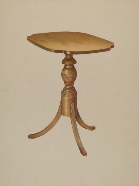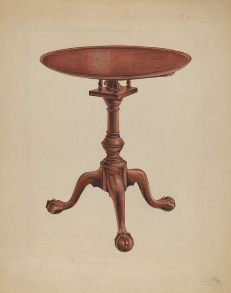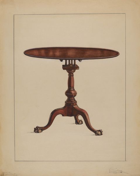 Editor: So, this is Carl Buergerniss’ "Candle Table," made in 1939 using watercolor and charcoal. It feels like a very straightforward, almost documentary depiction of… well, a candle table. What am I missing? What do you see in this piece? Curator: It's funny you say 'documentary,' because to me it feels deeply personal. The muted tones, the soft edges... it's like a memory, viewed through a gentle haze. Think about what a candle table signifies – intimacy, quiet moments, maybe even secrets whispered in the dark. Editor: So it's less about the object itself and more about the feelings it evokes? Curator: Exactly! Buergerniss isn't just painting a table; he’s painting a feeling, a mood. The way he uses watercolor creates this dreamy, almost ethereal quality. Does the geometric shape play some part to the message? Editor: I think that the table legs resemble a harp's neck. Am I too far off the mark with that analogy? Curator: Not at all! See, you are tuning into its essence, Editor! I also detect some subtle hints of Bauhaus design in the functionality, if that make sense? There is something elegant and refined about the structure, without any hint of excessive ornamentation. I am not an expert on period furniture, however I wonder, what message it sent, almost a hundred years ago, for an artist to isolate a singular table for their muse. Editor: Hmm… That definitely adds a layer of depth. I was so focused on the table as a physical object. Curator: Sometimes the most profound insights come from looking beyond the surface. It is just so much fun to delve deeper. Editor: I will remember that. Thanks for pointing me in the right direction, to look for that message! Curator: Absolutely! Keep those perceptive questions coming!
