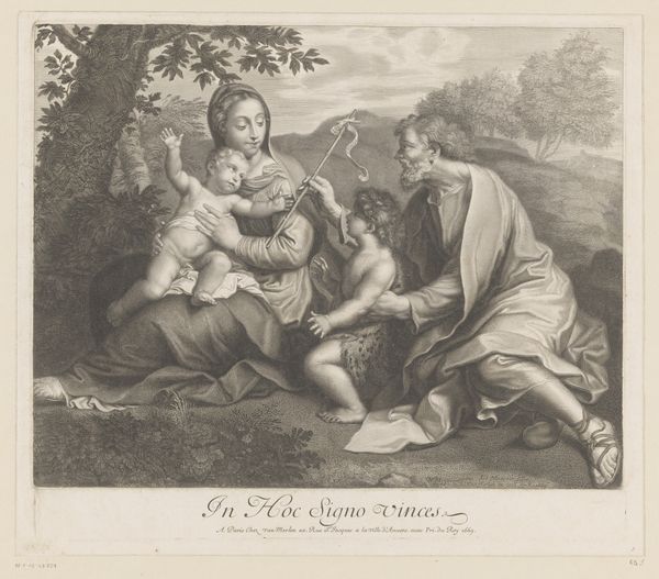 Curator: Let’s discuss this detailed print: "Maria met slapend Christuskind en twee engelen," made sometime between 1632 and 1693 by Francois de Poilly. Editor: It’s lovely, quite serene. The landscape backdrop seems to almost embrace the figures in the foreground, offering a comforting sense of enclosure. Curator: Indeed. De Poilly worked primarily with etching and engraving. Here we see an excellent example of the engraver's art; he creates a range of textures using only lines and dots. The quality of the paper itself must also have been crucial, being both durable and able to show this nuance. Editor: Looking at it from a contemporary lens, I am struck by the social dynamics depicted here: a protective Madonna amidst a natural setting. There's an intriguing tension between maternal care and the surrounding environment that implies the holy family are taking refuge in nature. It invokes ecological awareness; even divinity depends on the Earth’s generosity. Curator: You highlight an interesting point. Consider too that devotional prints such as this one had a vital function within the household; they facilitated domestic worship and piety through readily reproducible means, impacting society far and wide. Editor: Precisely. Further, this image presents a visual articulation of baroque ideals, a time when the church asserted its power visually and culturally amidst social changes and power disputes. The composition encourages reverence but also reminds us about broader historical power relations, questioning art’s function in reinforcing socio-political structures. Curator: Absolutely, and understanding the interplay of printmaking and the accessibility it provides brings us closer to acknowledging its deep-seated influence on disseminating ideas to contemporary audiences. The social context of its distribution is important in appreciating its cultural relevance. Editor: Thank you. This has underscored for me the continuing dialogue art invites, as relevant in discussions of gender, divinity, and socio-ecological responsibilities. Curator: Likewise, focusing on its mode of production reveals just how art shapes cultural norms beyond traditional aesthetics, even influencing societal habits related to value and religious sentiment.