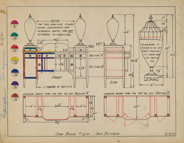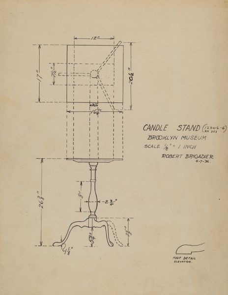 Editor: This is a drawing entitled "Tripod Table" by Arthur Johnson, dating from around 1936. It seems to be a technical sketch. It's on aged paper, giving it a vintage feel. The lines are crisp, precise. What compositional elements strike you most about this work? Curator: The most compelling aspects of this work are the relationship between line, form, and the handwritten text, and the geometry informing Johnson’s design. Note the delicate balance between the various elements—the circular tabletop, the curves of the legs ending in ball-and-claw feet, contrasted against the geometric spindle design above. Editor: It's interesting how you focus on the shapes. The handwritten text gives it a personal, almost intimate, quality, yet the drawing itself is so technical and precise. Does that contrast matter? Curator: Indeed. The hand-rendered nature softens the mechanical precision. This highlights the creative process, showing the artist's intent. Are you drawn to particular areas within the composition itself? Editor: I find the view of the spindle fascinating. The simple shapes create an almost abstract composition within the larger drawing. It’s functional but also aesthetically pleasing in its own right. Curator: Precisely. The functional design elevates to art, achieved through careful manipulation of line and form. It reminds us that beauty and utility are not mutually exclusive; instead, their intersection results in compelling works such as this. Editor: I see what you mean. I never thought about it that way. Thanks for pointing that out! Curator: My pleasure. Close visual examination allows for unique insights, don't you agree?
