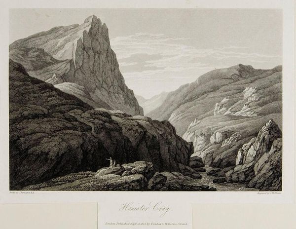 Curator: Charles Turner's "Mont Saint Gothard" captures a powerful mountain pass, a symbolic gateway. Editor: Immediately, I’m struck by the earthiness of it. The sepia tones emphasize the geological processes at play. The labor of the aquatint process itself echoes the mountain’s own formation. Curator: Consider this, the pass itself, historically, served as a crucial link, enabling cultural and economic exchange, but also representing the challenge of crossing boundaries. It's a place where man confronts nature’s grandeur. Editor: And those figures, almost obscured, remind us of the human labor invested in carving routes through such landscapes. The print itself is a product of labor, from the copperplate to the ink. Curator: The mountain as a symbol has long carried cultural weight—of the sublime, of spiritual aspiration. It reflects our enduring fascination with the monumental. Editor: Absolutely, and I think the printmaking process, with its multiple stages, mirrors that sense of endurance, of something built over time through a material transformation. Curator: Indeed, layers of meaning reflected in layers of process. Editor: A fitting encapsulation.
