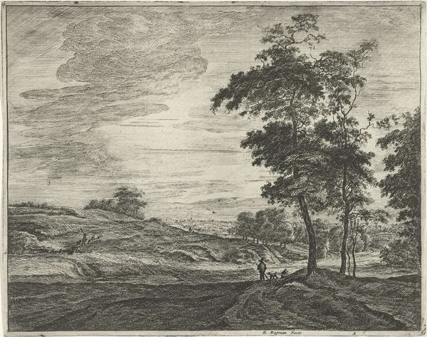 This landscape with trees and a small boat on a body of water was etched by Remigius Adrianus Haanen. Trees dominate this scene, and through centuries, trees have been laden with meaning, symbolizing life, growth, and connection to the earth. The image calls to mind the Romantic era, with its deep appreciation for nature, where trees represented the sublime and the spiritual. The boat on the lake suggests a journey, or a quest, a symbol of introspection, where the reflective surface of the water mirrors the soul's search for meaning. We can see similar themes in Caspar David Friedrich's landscapes, where solitary figures are dwarfed by the grandeur of nature. This symbolic imagery taps into a collective unconscious, resonating with our innate desire to understand our place in the world. The forest has always held a powerful place in our imagination. It evokes a sense of mystery and the unknown, a place where one might lose oneself, only to perhaps, find oneself anew. Haanen’s image invites us to pause and reflect on our own connection to the world, to nature, and to the very essence of existence.