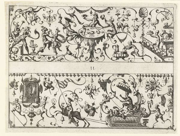 Curator: The work before us, made between 1690 and 1710, is entitled "Man met glas en kan in de handen en dansende man in ornamentele omlijsting", attributed to Gerrit Visscher, executed in ink via drawing and engraving. Editor: Intricate, isn’t it? At first glance, the ornate framing dominates. It’s almost baroque, this dizzying density of swirling forms that encase these peculiar figures. Curator: Indeed. The density and ornamentation speak directly to the socio-cultural context of the late 17th and early 18th centuries, where elaborate decoration symbolized wealth and sophistication, influencing everything from interior design to printmaking. It speaks of aristocratic patronage. Editor: I see how the ornament reflects a particular aesthetic of power, but looking closer at the composition itself, I'm struck by the balance between the two central figures. Despite being in separate frames, their mirrored poses create a visual harmony. Curator: Quite so. The arrangement hints at societal performances and perhaps the popular imagination. Printmaking then was very influential, think of its role as the visual internet of the period. Editor: Yes, I'm thinking about the use of ink itself; the line quality is incredibly controlled, enabling a stunning level of detail. It highlights form through contrast—dense cross-hatching defines volume while the blank paper provides the highlights. Curator: Absolutely. Prints like these functioned as a means to propagate style, and political agendas. They shaped perception but they also served to reflect back society to itself in very novel ways at the time. Editor: I can almost feel the artist's hand moving across the surface, creating an object of immense tactile and visual complexity. The density generates its own luminosity almost, which adds an almost uncanny mood. Curator: Reflecting on it, one starts seeing the ways in which artistic production became intrinsically linked with emergent print cultures to become something quite new. Editor: Yes, that tight visual vocabulary that spoke across the Western world. And I do appreciate how such seemingly simple graphic elements when put together convey such elegance.