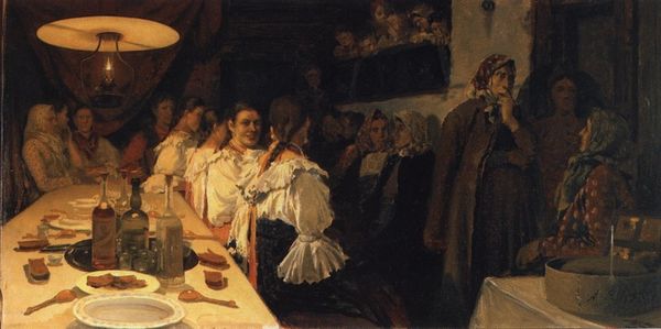 Gustave Courbet painted ‘After Dinner at Ornans’ with oil on canvas. Its deep tonal range and chiaroscuro draw us into the dimly lit interior of a post-meal scene. The painting is divided into two distinct zones: the left side, dominated by the white tablecloth, and the dark, cavernous right, anchored by the somber figure standing by the fireplace. This division isn't just spatial but also symbolic, with the table representing a space of communal consumption. Courbet's radical approach to realism challenged the idealized forms of academic painting. Instead of depicting grand historical or mythological scenes, he chose a seemingly mundane subject – a group of men relaxing after a meal. This shift in focus was a deliberate act, questioning established hierarchies and asserting the value of everyday life. The use of light and shadow plays a crucial role here. The way Courbet manipulates these elements creates a sense of intimacy, but also hints at the darker, less polished aspects of human existence. This contrast destabilizes traditional notions of beauty, emphasizing the importance of representing the world as it is.