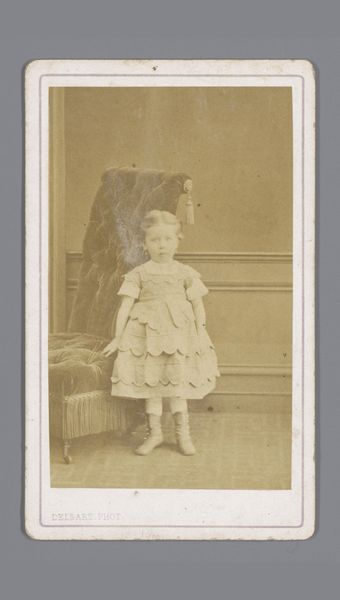 Curator: Let's take a look at "Portret van een onbekend meisje", or "Portrait of an Unknown Girl," taken between 1863 and 1866 by Auguste Blanche. It's a photograph, a form of genre painting really, with the studio listed at Photo. Anvers. Editor: It’s strikingly somber. The girl's expression feels almost prematurely world-weary for such a young face. The severe composition and the muted tones add to that impression. Curator: Well, we must contextualize it. Photography in the mid-19th century was hardly the snapshot affair of today. It was a process, an event. Think about the socio-economic implications. The child is in her best dress and clearly being presented to society. Editor: Exactly. The black stripes on the dress feel less like playful decoration and more like constraints. Note the way she clasps her hands, it suggests a certain vulnerability. And who decided that presenting girls in this precise way would promote some level of elevated societal standards? What agenda was being pushed? Curator: It highlights, though, the development of the photographic industry at that time. Blanche was running a studio in Antwerp and marketing an idealized image to the burgeoning middle class. Editor: Right, this photograph is not just about preserving a likeness but about participating in a carefully constructed visual language of class and respectability. The absence of any playfulness points to the societal pressures put upon young girls to perform and conform. Who knows if that look of anxiety wasn't simply due to standing so still for the image to come into focus? Curator: And we shouldn’t forget the inherent politics of portraiture. The very act of having one’s image taken, even an anonymous subject, was about affirming a certain social standing and participating in visual culture of the time. Editor: Agreed. The 'unknown girl' stands in for all girls presented, displayed, marketed. There are echoes of power and its performance even here, wouldn't you say? Curator: Definitely. I see this photograph as a time capsule, capturing not just an image of a child but the aspirations and anxieties of a changing society, even the subtle resistance one feels just under the surface of those times. Editor: It reminds us how art can act as a mirror, reflecting both what society wanted to see and what it often chose to ignore. A very profound artifact in that way.