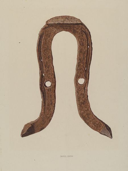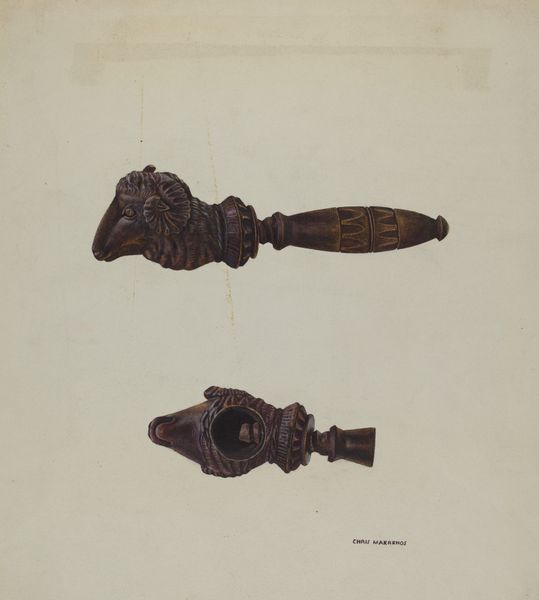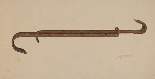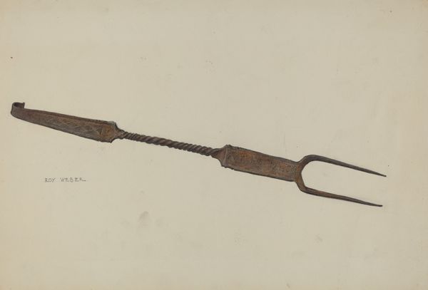 Editor: This is "Cap and Ball Revolver," a colored pencil drawing by LeRoy Robinson, dating from around 1937. There's something very tactile about it. I can almost feel the smooth wood and cold metal. What do you make of it? Curator: Well, right away, I notice the interplay between representation and reality. This isn't just a drawing of a weapon; it's a drawing *made* with specific materials and through a certain labor process. What social circumstances might have led Robinson to create a replica rather than possessing the object itself? The drawing medium contrasts with the actual pistol's materiality. It begs the question: What did it *mean* to painstakingly render these weapons, knowing he likely couldn't afford them himself? Editor: That’s an interesting point – the accessibility of art materials versus the guns themselves. Do you think the choice of medium speaks to something about access to resources? Curator: Absolutely! Think about the economics of the time, the socio-economic landscape that likely relegated the artist to using what was at hand – relatively inexpensive colored pencils – to depict objects that signified power and, arguably, unattainable aspirations. This also plays into the blurring of high art versus "folk art," considering this artist may have existed outside the traditional art world structures. Editor: So, the drawing itself becomes a statement about class and aspiration. Curator: Precisely. The very act of creation and the materials used are intrinsically linked to socio-economic conditions and reflect upon ideas surrounding production, desire and power. Editor: This has really changed how I view the piece. It’s not just a rendering of a gun. Curator: Exactly. By examining the materiality and mode of production, the drawing transforms from simple representation to a reflection on labor and consumerism within a specific historical context.