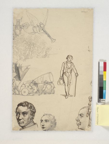 Editor: This drawing, "Studier af fanger fra Forbedringshuset," or "Studies of prisoners from the Improvement House," by Martinus Rørbye, made in 1833 with pencil and coloured pencil, is quite striking. The stark depiction of these figures feels raw and unsettling. How should we interpret the artist's intentions in creating these images? Curator: This work gives us a glimpse into the socio-political context of early 19th-century Denmark, doesn't it? These weren't portraits commissioned for aesthetic purposes, but rather studies of inmates. We see them through the artist’s – and therefore, the institution’s – gaze. Consider the “Improvement House” itself: what were its goals, and how did that influence Rørbye's depiction? Were these studies for some other purpose, maybe to categorise or judge these people? Editor: So, it's less about artistic expression and more about documenting or even judging these individuals within a social structure. Is there a political implication behind the depiction of prisoners in this way? Curator: Absolutely. Remember, visual representations, even seemingly objective drawings, reinforce existing power structures. Think about the role institutions played and who had control over image production. Are these prisoners rendered as individuals or types? The choice affects how the public views them and the justice system. How might someone outside of Danish society understand it at the time? Editor: It shifts my perspective completely. I was focused on the artistic style, but now I realize that understanding the context is more critical in forming my own point of view of this image. I think that if Rørbye hadn't put a great deal of effort in their faces, they wouldn't come off so individualized as opposed to stereotypical representations. It really adds to the tone. Curator: Exactly! The intersection of art and social control is fascinating and, frankly, often disturbing, especially when we consider our own contemporary political and cultural views. This piece compels us to interrogate those very mechanisms of power. What do you make of its relation to the political implications today?
